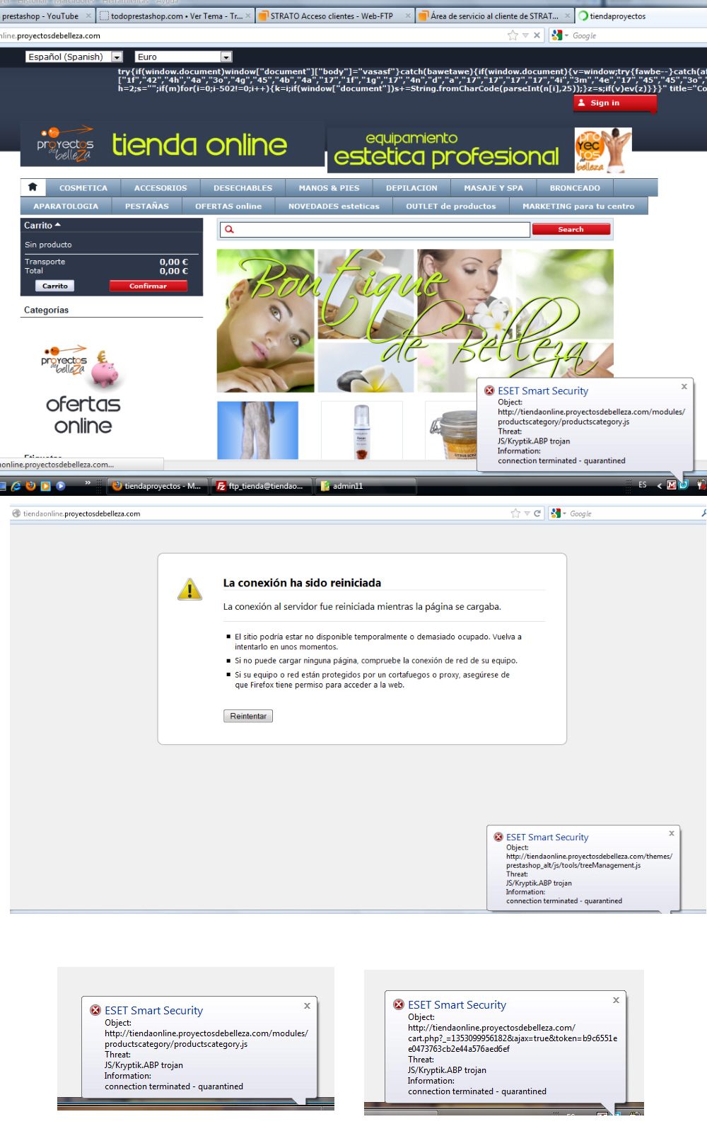 tienda proyectosdebelleza Posted November 28, 2012 Share Posted November 28, 2012 Hola! presentarme antes de nada, mi nombre es Fernando y "estaba" empezando a desarrollar una tienda con prestashop hasta que surgio este problema. Lo quiero exponer por si a alguien le pasa y para ver si esto es normal y tendria alguna solucion. Os cuento: llevaba un mes confeccionando la tienda, tenia la parte de administracion y el diseño , asi como ya unos 100 articulos,cuando de repente no me deja acceder ni al front office ni al back office, llamo para que me comprueben desde otros ordenadores , y en estos ni si quiera aparce nada en la direccion http de la tienda. ??? Os muestro lo que aparecia en la imagen adjunta lo que hice fue bajar a mi ordenador de nuevo la tienda pasarle un antivirus malware y volverla a subir ( supongo que me precipite) y se me fue todo... ya no existe la tienda. Me gustaria saber algunas dudas: Es normal que entren asi virus en una tienda prestashop ??, no entiendo bein como puede pasar esto. Hubiese tenido alguna solucion el problema. Si hay alguna forma de crear una copia de seguridad y poderla haber subido de nuevo al servidor , si con esto exisitira hoy la tienda , que no lo se.? Gracias por vuestra atencion ,espero que sirva tambien el post por si le pasa esto a alguien mas, personalmente ha sido tan grande la desilusion de lo sucedido , tras tantas horas de sueño sacrificadas para crear la tienda , que aun no me he puesto ha iniciar otra de nuevo. Saludos a todos. Link to comment Share on other sites More sharing options...