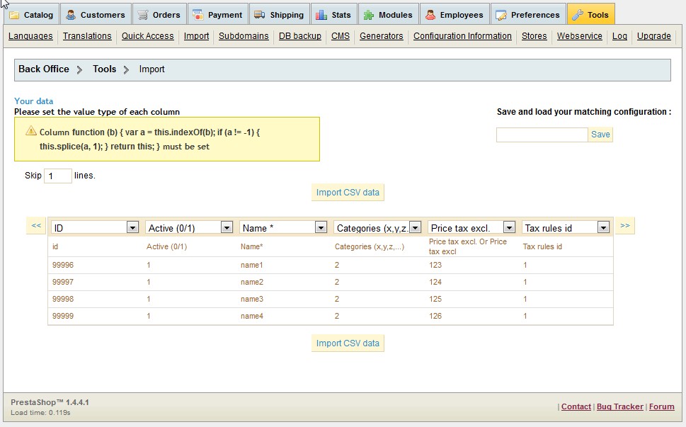 thx2012 Posted November 29, 2012 Share Posted November 29, 2012 PrestaShop v.1.4.4.1 When I attempt to import CSV, I receive Column Funtion Error: Column function ( { var a = this.indexOf(; if (a != -1) { this.splice(a, 1); } return this; } must be set I submitted a bug report and the tech stated that the bug would be fixed in v.1.4.9.0, however the CSV error is still present in that version as well. On versions v.1.4.4.0 & v.1.5.2.0 CSV import works, however there are other buggy areas of concern with those two versions, mainly with v.1.5.2.0, so we can not upgrade in that direction. I've attempted replacing all the files in the /classes/ folder from v.1.4.4.0 over to my version 1.4.4.1, and even replaced the /admin/tabs/AdminImport.php to no prevail. Any help in resolving this bug is greatly appreciated! Link to comment Share on other sites More sharing options...