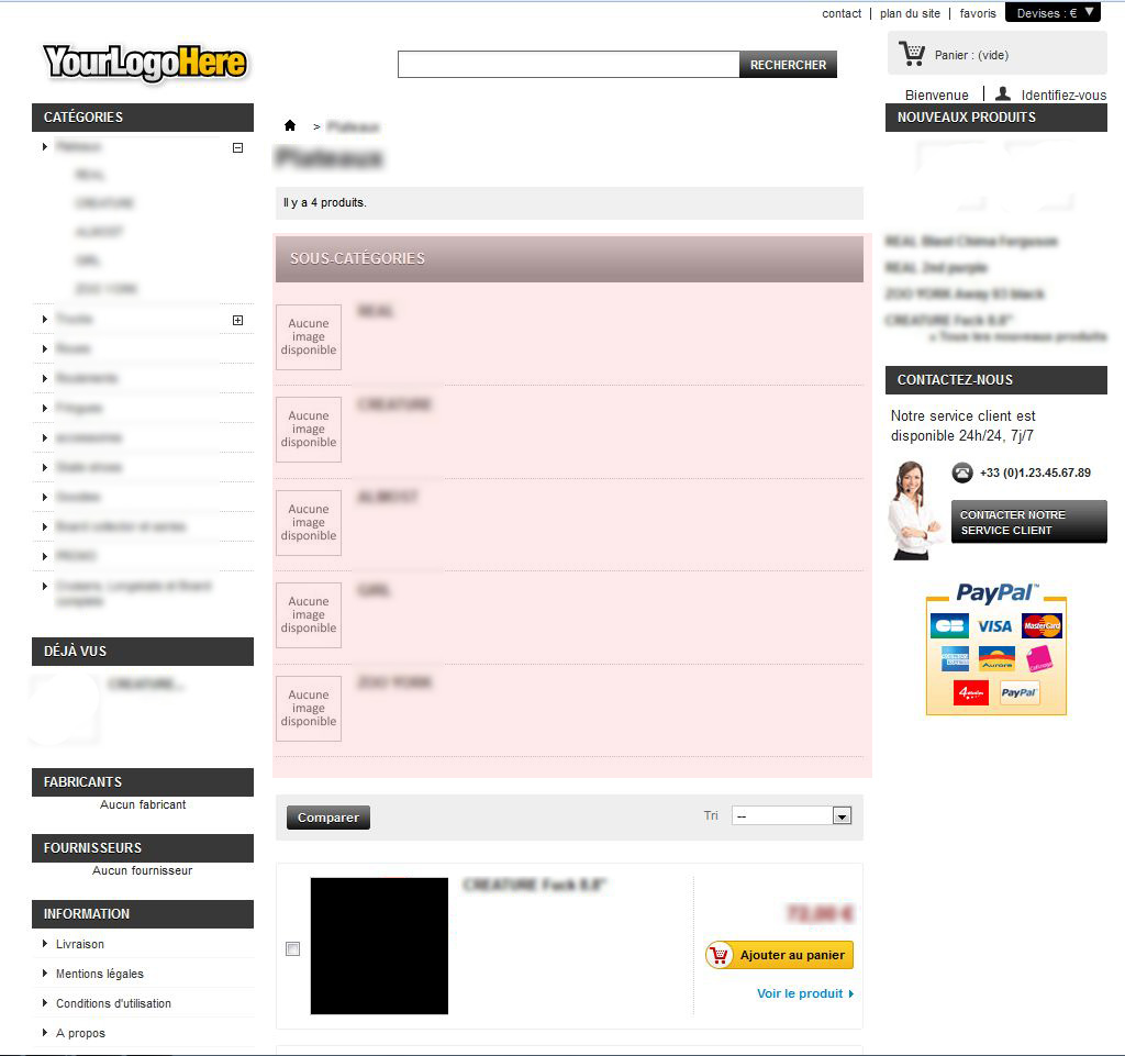 arftbird Posted December 3, 2012 Author Share Posted December 3, 2012 Merci Chichipool : je peut te répondre a la place de ChDuyp, si vous souhaitez enlevé le bloc sous-categorie il suffit d'aller dans le fichier category.tpl de votre théme : et supprimé de la ligne 72 jusqua 93 {if isset($subcategories)} <!-- Subcategories --> <div id="subcategories"> <h3>{l s='Subcategories'}</h3> <ul class="inline_list"> {foreach from=$subcategories item=subcategory} <li class="clearfix"> <a href="{$link->getCategoryLink($subcategory.id_category, $subcategory.link_rewrite)|escape:'htmlall':'UTF-8'}" title="{$subcategory.name|escape:'htmlall':'UTF-8'}" class="img"> {if $subcategory.id_image} <img src="{$link->getCatImageLink($subcategory.link_rewrite, $subcategory.id_image, 'medium_default')}" alt="" width="{$mediumSize.width}" height="{$mediumSize.height}" /> {else} <img src="{$img_cat_dir}default-medium_default.jpg" alt="" width="{$mediumSize.width}" height="{$mediumSize.height}" /> {/if} </a> <a href="{$link->getCategoryLink($subcategory.id_category, $subcategory.link_rewrite)|escape:'htmlall':'UTF-8'}" class="cat_name">{$subcategory.name|escape:'htmlall':'UTF-8'}</a> </li> {/foreach} </ul> <br class="clear"/> </div> {/if} Link to comment Share on other sites More sharing options...