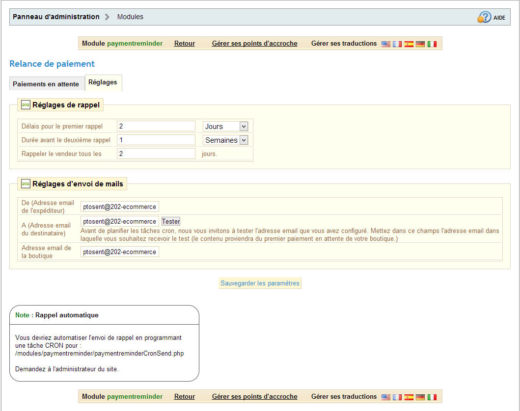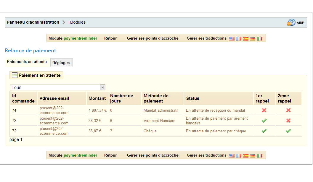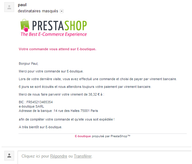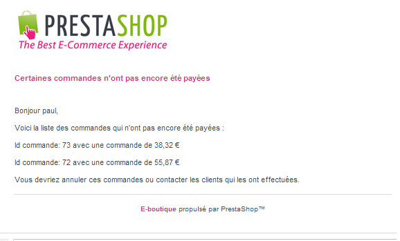 202-Ecommerce Posted December 3, 2012 Share Posted December 3, 2012 (edited) Bonjour à tous ! Les fêtes de fin d'année arrivent à grands pas ! Avez-vous pensé aux commandes n'ayant pas été réglés ? Maximisez le taux de conversion de vos ventes en relançant les clients qui ont oubliés de vous régler la facture dû... 202-ecommerce a pensé à vous, vous les e-commerçants et aussi vous les agences qui souhaitez rendre les rêves des e-commerçants en une réalitée. Notre module permet de relancer un client qui a choisi de payer par chèque, virement bancaire, mandat administratif (http://addons.prestashop.com/fr/modules-paiement-prestashop/6297-Mandat-administratif.html) ou autres... Comme vous pouvez le voir ci-dessus, vous avez accès à un tableau récapitulatif avec les commandes en attente de paiements avec les données comme le prix, le nombre de jours écoulés depuis que la commande a été passé etc.. Une colonne 1er rappel et une colonne 2eme rappel vous montre si les e-mails ont déjà été envoyés ou pas. Pour cela, il vous faudra planifier une tâche cron. Le module permet aussi de programmer le délai d’envoi en saisissant le nombre de jours après que le client ait passé commande pour la première relance ainsi que pour la deuxième relance. Un mail vous est envoyé pour signaler la non réception du règlement de votre client au bout de X jours programmable après la deuxième relance. Lors de l’envoi des mails de relances, selon la méthode de paiement choisie, un récapitulatif de l’adresse à laquelle envoyer le chèque ou des coordonnées bancaires seront spécifiés dans le mail. Pour plus d'information, visitez la fiche du module : http://addons.prestashop.com/fr/processus-de-commande/6614-Relance-de-paiement.html Module compatible : 1.4.7.0 -> 1.5.2.0 (pour l'instant, les versions plus ancienne viendront plus tard). Merci bien Edited December 12, 2012 by 202-Ecommerce (see edit history) Link to comment Share on other sites More sharing options...