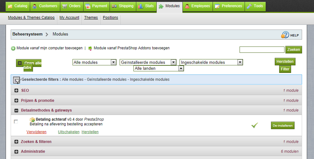 Frevab Posted December 31, 2012 Author Share Posted December 31, 2012 Hoi Frevab, Zoals eerder vermeld ben ik ook op zoek naar een module voor een betaling achteraf, ik heb de zip gedownload en geinstalleerd maar hij laat deze betaalmethode niet zien bij checkout, zie ik iets over het hoofd? Bedankt voor het delen van deze module en zie je antwoord graag tegemoed! Hij hoort gewoon bij de modules onder Betaalmethodes/Gateways te staan (zie screenprint bijlage). Moet wel bij staan dat hij geinstalleerd is. Kan vervolgens wel verdwijnen bij de checkout als hij niet van toegestaan is voor de valuta, klanten groep of land(en). In te stellen in BackOffice/Beheersysteem > Payments. groet Freek Link to comment Share on other sites More sharing options...