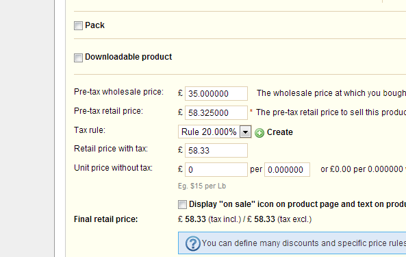 tobes Posted December 10, 2012 Share Posted December 10, 2012 (edited) Hi, On my customers' site, I'm only seeing prices in the backend without VAT. Previously the Base Price has shown the price without VAT and the Final Price shows the retail price with VAT added. The retail price in the frontend is displayed correctly, though. The tax rule is set to 20%, and I've checked that that has 20% applied for all countries and territories in the tax rules. If this cannot be easily resolved, my customer is keen to stop using the website to calculate taxes, and simply to work with final retail prices, with tax set to 0. As a tax invoice will be included with all sales, are there any disadvantages to doing this? He sells some products which are not liable to VAT (some foodstuffs and safety helmets for example) if this changes the situation. Thanks for any assistance. Edited December 10, 2012 by tobes (see edit history) Link to comment Share on other sites More sharing options...