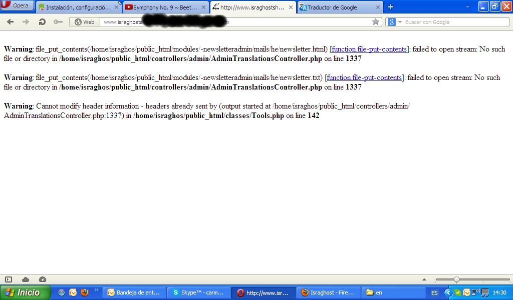 junnecito Posted December 11, 2012 Share Posted December 11, 2012 Buenos días: Últimos errores que encuentro en la instalación de la 1.5.2, espero de verdad que sean los últimos. Estoy traduciendo los mails en hebreo y cuando doy a guardar me sale lo siguiente: Warning: file_put_contents(/home/israghos/public_html/modules/-newsletteradmin/mails/he/newsletter.html) [function.file-put-contents]: failed to open stream: No such file or directory in /home/israghos/public_html/controllers/admin/AdminTranslationsController.php on line 1337 Warning: file_put_contents(/home/israghos/public_html/modules/-newsletteradmin/mails/he/newsletter.txt) [function.file-put-contents]: failed to open stream: No such file or directory in /home/israghos/public_html/controllers/admin/AdminTranslationsController.php on line 1337 Warning: Cannot modify header information - headers already sent by (output started at /home/israghos/public_html/controllers/admin/AdminTranslationsController.php:1337) in /home/israghos/public_html/classes/Tools.php on line 142 Adjunto pantallazo para que podais ver, yo personalmente no se lo que debo hacer en estos casos, alguien podria ayudarme por favor... Gracias por adelantado. Link to comment Share on other sites More sharing options...