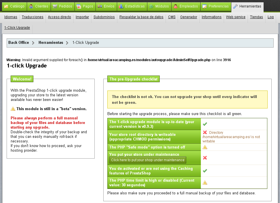 ClanMayo Posted December 14, 2012 Author Share Posted December 14, 2012 (edited) Perdón... el problema lo tengo con esto: The checklist is not ok. You can not upgrade your shop until every indicator will not be green. Before starting the upgrade process, please make sure this checklist is all green. The 1-click upgrade module is up-to-date (your current version is v0.9.3) Your store root directory is writeable (appropriate CHMOD permissions)Directory /home/virtual/areacamping.es/ is not writable The PHP "Safe mode" option is turned off You put your store under maintenance You de-activated or are not using the Caching features of PrestaShop The PHP time limit is high or disabled (Current value: 30 segundos) Please also make sure you proceeded to a full manual backup of your files and database. Que debo hacer? Por favor, ayuda... Edited December 14, 2012 by ClanMayo (see edit history) Link to comment Share on other sites More sharing options...