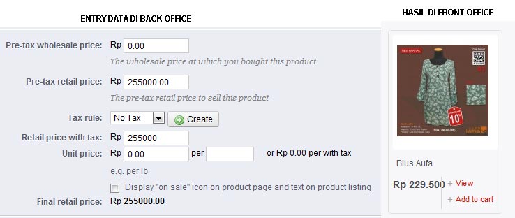 gonebdg - webindoshop.com Posted December 15, 2012 Share Posted December 15, 2012 Kalau bermasalah di "TAX" seharusnya tampilan harga lebih besar dari data harga yang telah di input Pada lampiran gambar Anda, terlihat harga di F.O lebih kecil dari data harga di B.O Kemungkinan ada pengaturan potongan harga yang aktif pada produk tsb (diskon 10%), sehingga harga di Front Office nilainya tertera lebih kecil. Silahkan Anda periksa lagi data entry product di Back Office > Discount atau di Specific prices Link to comment Share on other sites More sharing options...