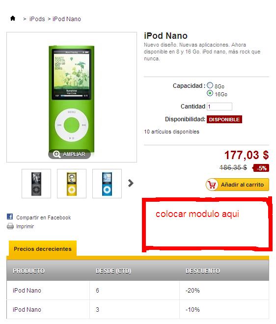Dimar Posted December 14, 2012 Share Posted December 14, 2012 (edited) Solo necesito alguna orientacion Necesito colocar un modulo como aparece en la imagen adjunta, no se si voy mal, pero e revisado las posiciones de los modulos pero como la parte donde aparece los precios y el boton Añadir al carrito no es un modulo, entonces creo que hay que tocar el archivo product.tpl, mi duda es como llamar a un modulo desde el archivo product.tpl Alguien que pueda orientarme por favor?? Edited December 14, 2012 by Dimar (see edit history) Link to comment Share on other sites More sharing options...