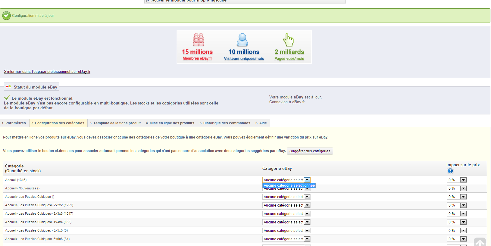 Solamode Posted February 13, 2013 Share Posted February 13, 2013 Voici la pièce jointe correspondante a la page concernant la configuration des catégories ! Bonjour, Effectivement, moi aussi j'ai le mémé problème. J'utilise PrestaShop™ 1.4.9.0 et eBay v1.3.6 par PrestaShop. Quelqu'un peut nous aider ? Merci Link to comment Share on other sites More sharing options...