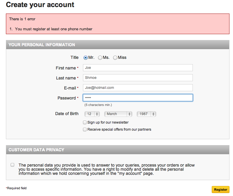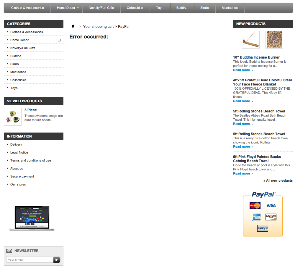 Stone0388 Posted December 19, 2012 Share Posted December 19, 2012 Hello everyone, I've had a few issues with the check out process, and right when I think I have it figured out something else pops up. The first problem is, if you try to create a new account to check out and fill in all required information, it will not let you advance past the first page because it says it needs 1 phone number. The only problem is there is no place to enter a phone number. I've attached a photo. Second problem is, after adding items to the cart and trying to check out as guest by clicking the check out button, all that happens is the homepage reloads. Finally, if you happen to actually have an existing account and log in to check out, it will take you to the final screen that says "Please confirm your order by clicking I confirm order" so I do, and then I have an error page. I've also listed 2 pictures of this. Any help would be greatly appreciated. If you guys could test it your self, I've made a set of skull mugs available to add to the cart for testing. Thanks. -Sean Link to comment Share on other sites More sharing options...