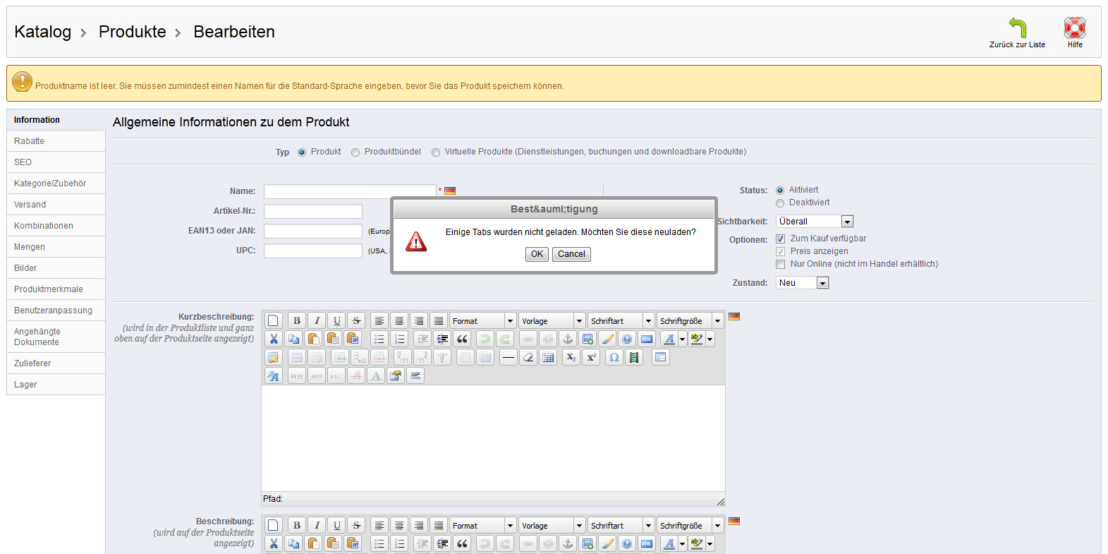 MikeKoenig Posted December 20, 2012 Share Posted December 20, 2012 Hallo zusammen, ich hab mal wieder zwei neue Feher entdeckt und kann nun keine Artikel mehr einstellen. Fehler Nr.1: Beim erstellen einen neues Produktes kommt folgende Fehlermeldung: "Einige Tabs wurden nicht geladen. Möchten Sie diese neuladen?" Dazu noch ein Bild. Kann zwar Produktdetails eingeben (Information), wenn ich bei der Fehlermeldung auf "Cancel" gehe aber bei der Preiseingabe (Rabatte) ist es vorbei, kommt nur noch eine weiße Seite. Fehler Nr.2: Wenn ich in meinem Shop bin und bestimmte Artikel anklicke, bekomme ich nur eine weiße Seite. Wird diese dann aktualisiert, dann kommt der Artikel auch. Bin langsam am verzweifeln, weil jeden Tag was neues dazu kommt. Kann mir wer vielleicht eine alternative zu Prestashop nennen? Schonmal Danke für die Hilfe Informationen auf Ihrem Server Informationen auf Ihrem Server: Linux #3 SMP Wed Nov 7 22:50:51 CET 2012 x86_64 Version der Server-Software: Apache PHP-Version: 5.2.17-0.dotdeb.0 Speichergrenze: 56M max_execution_time: 30 Datenbank-Informationen MySQL-Version: 5.5.28-1~dotdeb.0 MySQL-Engine: InnoDB Tabellen-Präfix: ps_ Informationen über Ihren Shop PrestaShop-Version: 1.5.2.0 URL Ihres Shops: http://shop.tuningauktion.de/ Name des verwendeten Themas: default Link to comment Share on other sites More sharing options...