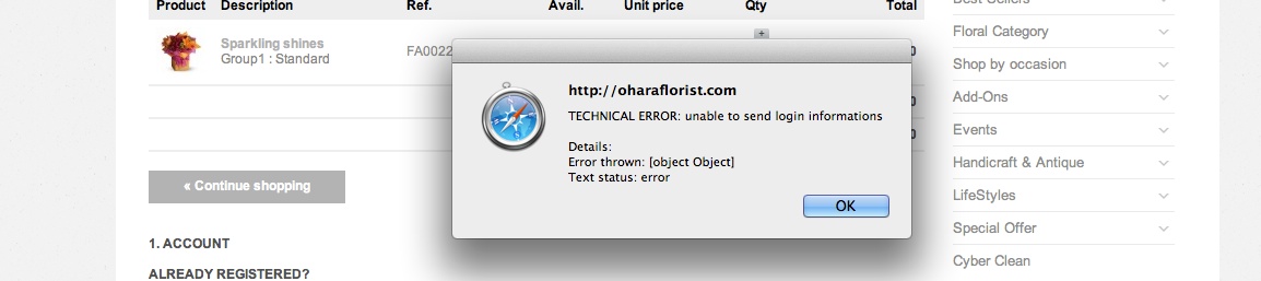 If you add any item into shopping cart, check out, and click on the bottom LOGIN, it pops out a window on the error as posted earlier.
