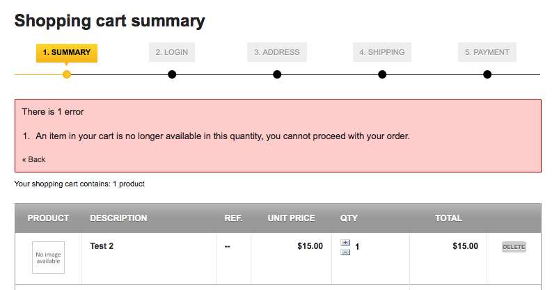 PRaymondJr Posted December 21, 2012 Share Posted December 21, 2012 Regardless of the product, every customer receives the same error in their shopping cart summary page and is not allowed to purchase any items. The error reads: There is 1 error An item in your cart is no longer available in this quantity, you cannot proceed with your order." Anyone else have this error? Do you know why you have this error and how can it be corrected? Thanks for your help. -Paul Link to comment Share on other sites More sharing options...