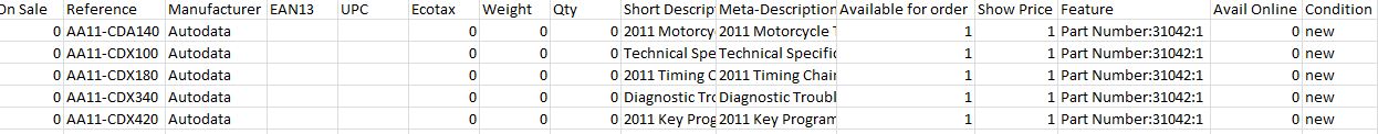 Manufacturer, EAN13, UPC, Ecotax, Weight, Qty, Short Description, Description, Meta-title,