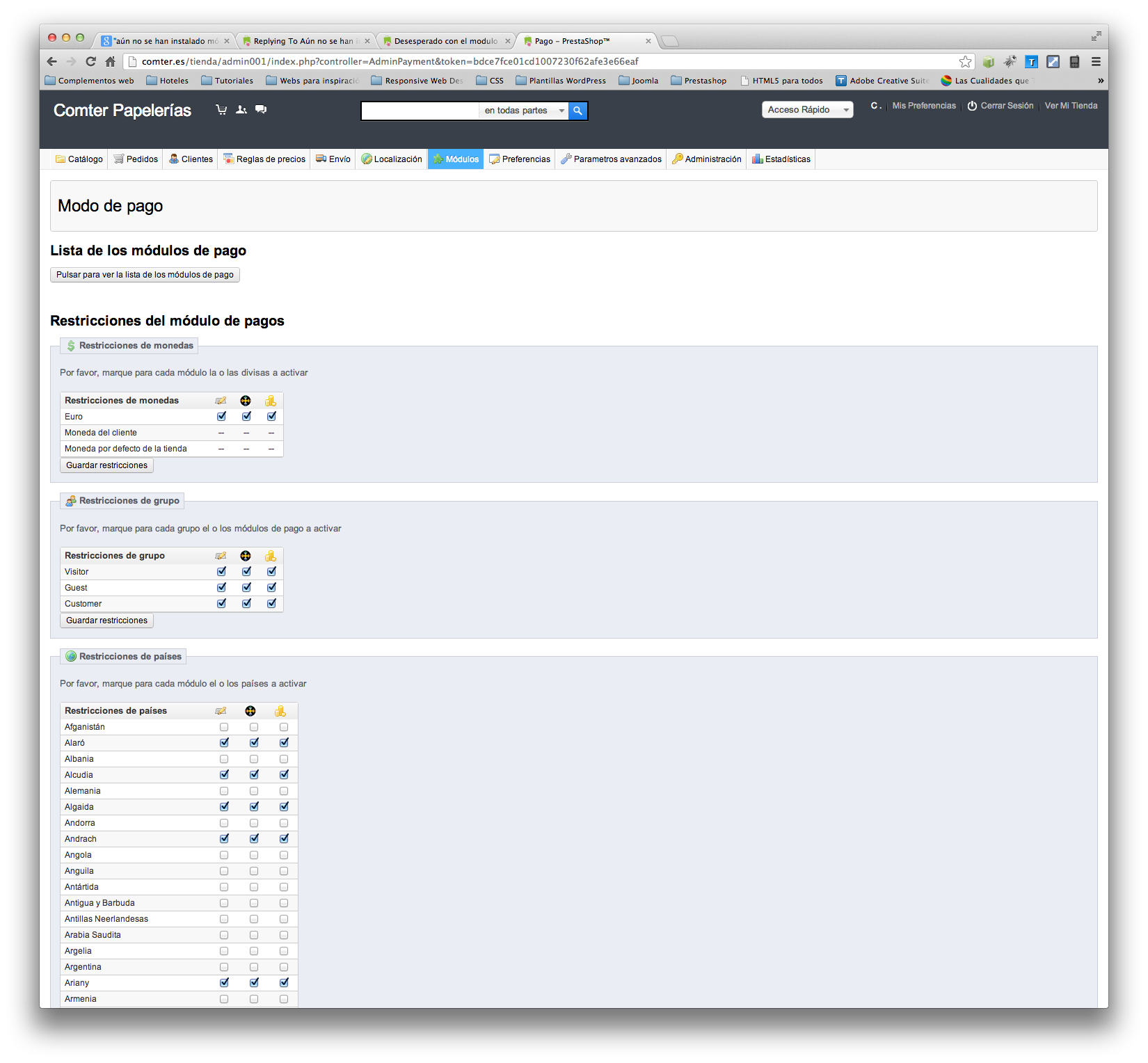 Mi problema es el siguiente, tengo instalados 3 módulos de pago, pero cuando efectúo una compra, al llegar al paso del pago sólo me muestra el siguiente mensaje de error "Aún no se han instalado módulos de pago".