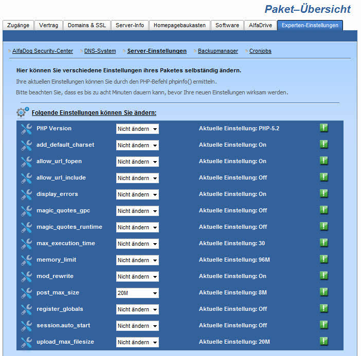 max48308 Posted January 1, 2013 Author Share Posted January 1, 2013 (edited) Da haben sich unsere Beiträge ja gerade knapp überschnitten. Ich hänge die aktuellen Einstellungen bei meinem Provider hier mal als Bild an. ..... Sorry - habe den Post nochmal geändert und das aktualisierte Bild eingefügt. ..... Irgendwie nimmt er immer das erste Bild. Auf jeden Fall steht post_max_size jetzt auch auf 20M. Edited January 1, 2013 by max48308 (see edit history) Link to comment Share on other sites More sharing options...