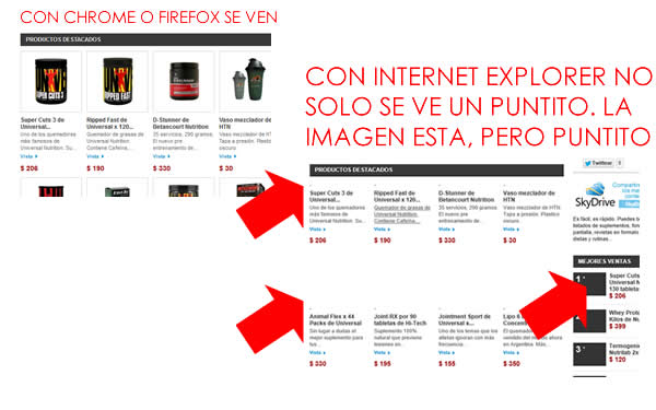 DeMusculos Posted January 1, 2013 Share Posted January 1, 2013 Estimados Amigos: Mi tienda es www.demusculos.com y he actualizado a Prestashop 1.5.3.1 En Firefox todo se ve bien. En Chrome todo se ve bien. En Internet Explorer 10, el que viene con Windows 8 no me salen las imagenes de los productos en categorías y en el producto en si. Adjunto.... A ustedes le pasa o es mi PC? Link to comment Share on other sites More sharing options...