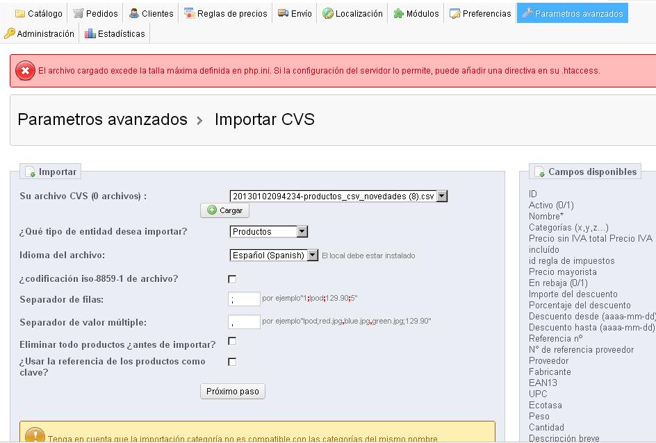entendiendonos Posted January 3, 2013 Share Posted January 3, 2013 (edited) Estoy trabajando con prestashop 1.5.0.17 con el tema leo sport en localhost y cuando he ido a hacer una importación masiva (5000 artículos aprox.) me ha salido el siguiente mensaje que también muestro en imagen adjunta: El archivo cargado excede la talla máxima definida en php.ini. Si la configuración del servidor lo permite, puede añadir una directiva en su .htaccess. Es una operación que he hecho en multitud de ocasiones en prestashop 1.4.9.0 en servidor y jamas me dio ese error. ¡¡Socorro!! ¿que he de hacer?. Un saludo y gracias por vuestra atención. Edited January 4, 2013 by entendiendonos (see edit history) Link to comment Share on other sites More sharing options...