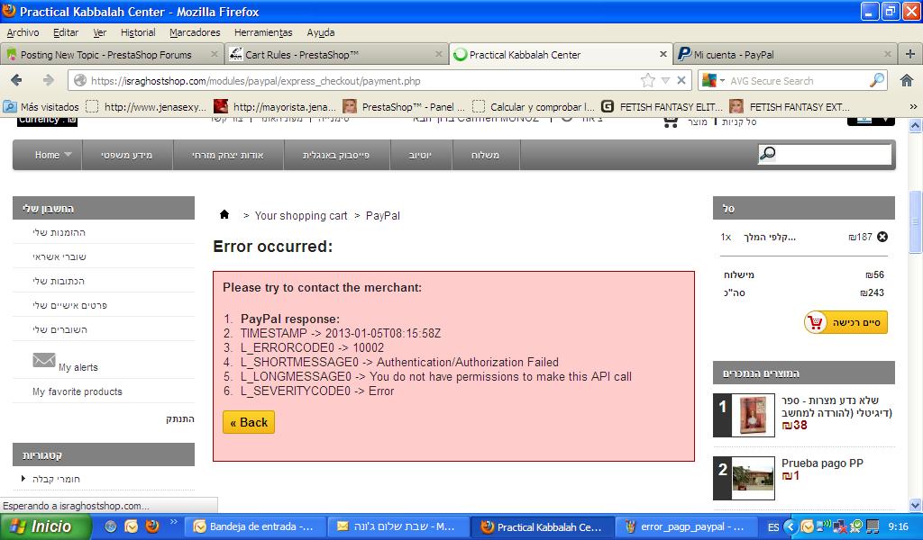 junnecito Posted January 5, 2013 Share Posted January 5, 2013 Buenos días: Otra vez yo con los problemas de la actualización... esta vez es con PayPal, de pronto veo que hay problemas con el pago por PayPal, ayer vi un pedido de un cliente que intento pagar por PayPal y veo el mensaje de PayPal en la hoja de pedido "At 01/05/2013 from Private: PayPal response:TIMESTAMP -> 2013-01-04T22:06:01ZL_ERRORCODE0 -> 10729L_SHORTMESSAGE0 -> Shipping Address State EmptyL_LONGMESSAGE0 -> The field Shipping Address State is requiredL_SEVERITYCODE0 -> Error" Les adjunto pantallazo. Esta mañana hice un pedido de prueba con un producto virtual a descargar y el pago se realizo sin problema por PayPal, luego hice otra prueba un un producto normal, con envío por transportista y al elegir pagar por PayPal me sale el error siguiente " Please try to contact the merchant: PayPal response: TIMESTAMP -> 2013-01-05T08:15:58Z L_ERRORCODE0 -> 10002 L_SHORTMESSAGE0 -> Authentication/Authorization Failed L_LONGMESSAGE0 -> You do not have permissions to make this API call L_SEVERITYCODE0 -> Error" Adjunto pantallazo. Por favor necesito ayuda urgente, ya estoy atontado con estos errores y no tengo ni idea de como reparar esto... En espera de vuestra ayuda, reciban un saludo Buen fin de semana a todos Solucionado: Fue error de configuración, se borraron los datos API en el bloc PayPal Link to comment Share on other sites More sharing options...