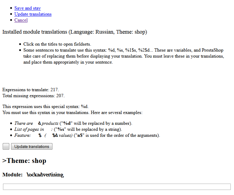 iggywebprom Posted January 7, 2013 Author Share Posted January 7, 2013 I found what it causes that problem: On server in admin/themes/default/template/controllers/translations/helpers/view/translations_modules.tpl Find this (2 times): {$template_name|replace:'.':''} - remove /replace:'.':'' and now the page works! Strange, but it helped me to see this page normally. My template names have no dots, so it's not a problem at all. Please check what causes this conflict. But I can work now. Need to check also geolocation page. Link to comment Share on other sites More sharing options...