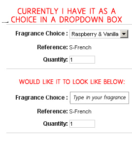 nadiap Posted January 6, 2013 Share Posted January 6, 2013 (edited) I've made up a few different attributes with values, but would also like to have an attribute where I have a text box where a customer can input their own choice of fragrance eg: Select your fragrance: Type fragrance choice (that would be the default value & customer can override this and type in their own choice) Thanks for any help you can provide -- I have over 20 possibile selections and it would be easier if the customer could write their own selection in the box ??? I attach a picture of what I use now, but shows how I'd like it if possible (hope pic explains it better) Is this possible? Using version 1.5.3 Edited January 6, 2013 by nadiap (see edit history) Link to comment Share on other sites More sharing options...