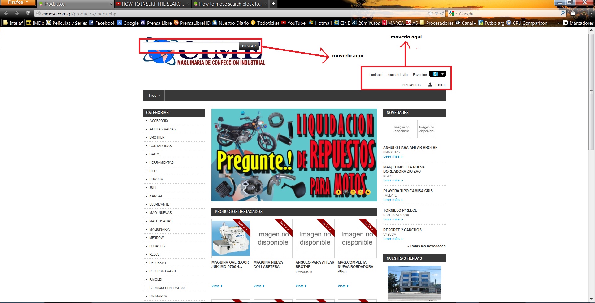 sinname Posted January 7, 2013 Share Posted January 7, 2013 (edited) Buenas Noches... he buscado en este foro y google pero pero no he hayado solucion y he visto la manera de responder de ustedes lo mas pronto posible. bueno mi problema es que el modulo buscar queda montado sobre mi logo y quiero moverlo a la derecha al igual que los vinculos de "inicio mapa del sitio favoritos" a la parte superior he buscado el codigo fuente para moverlo con "top" y "left" pero no lo he encontrado. todo se ha movido despues de cambiar el logo. Espero su ayuda y dejo la imagen de muestra y desde ya muchas gracias por su ayuda mi sitio es: www.cimesa.com.gt/productos Edited January 8, 2013 by sinname (see edit history) Link to comment Share on other sites More sharing options...