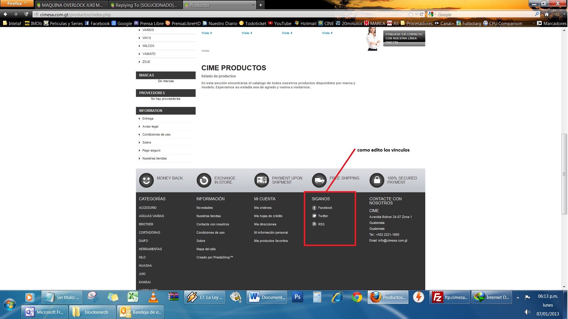 nadie Posted January 8, 2013 Share Posted January 8, 2013 Ya lo he hecho y de nuevo muchas gracias nadie. aprovechando y si es contra las reglas del foto pues abrire otro post. Pero como edito los vinculos de las redes sociales. lo he medio buscado pero si no lo sigo buscando en internet =) y sea como sea MUCHAS GRACIAS! Las redes sociales, del pie de pagina es un modulo, aquí: http://victor-rodenas.com/2012/11/13/guia-configurar-redes-sociales-en-el-pie-de-pagina-en-prestashop-1-5/ tienes explicado como configurarlas. PD: Recuerda siemore abrir un tema nuevo. Un placer ayudarte y servirte ! 1 Link to comment Share on other sites More sharing options...