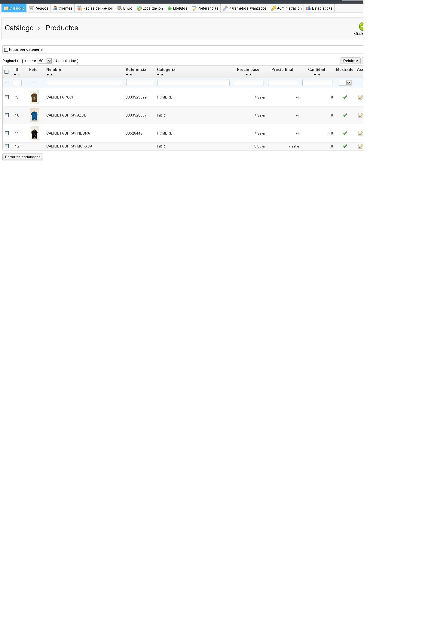 tate75 Posted January 13, 2013 Share Posted January 13, 2013 (edited) Buenas tardes: Estoy montando mi primera web con prestashop, pero me encuentro con innumerables problemas con los que no contaba, ahora mismo el mas importante que tengo, es que los productos no me aparecen el el front-office, es decir, me aparece que en la categoría hay tres productos pero no los presenta, sin embargo en el back-office si aparecen. Tengo la versión 1.5.0.17 ya que el modulo 1-click upgrade tampoco me funciona y no puedo actualizar la web. Muchas gracias por adelantado. Edited January 14, 2013 by tate75 (see edit history) Link to comment Share on other sites More sharing options...