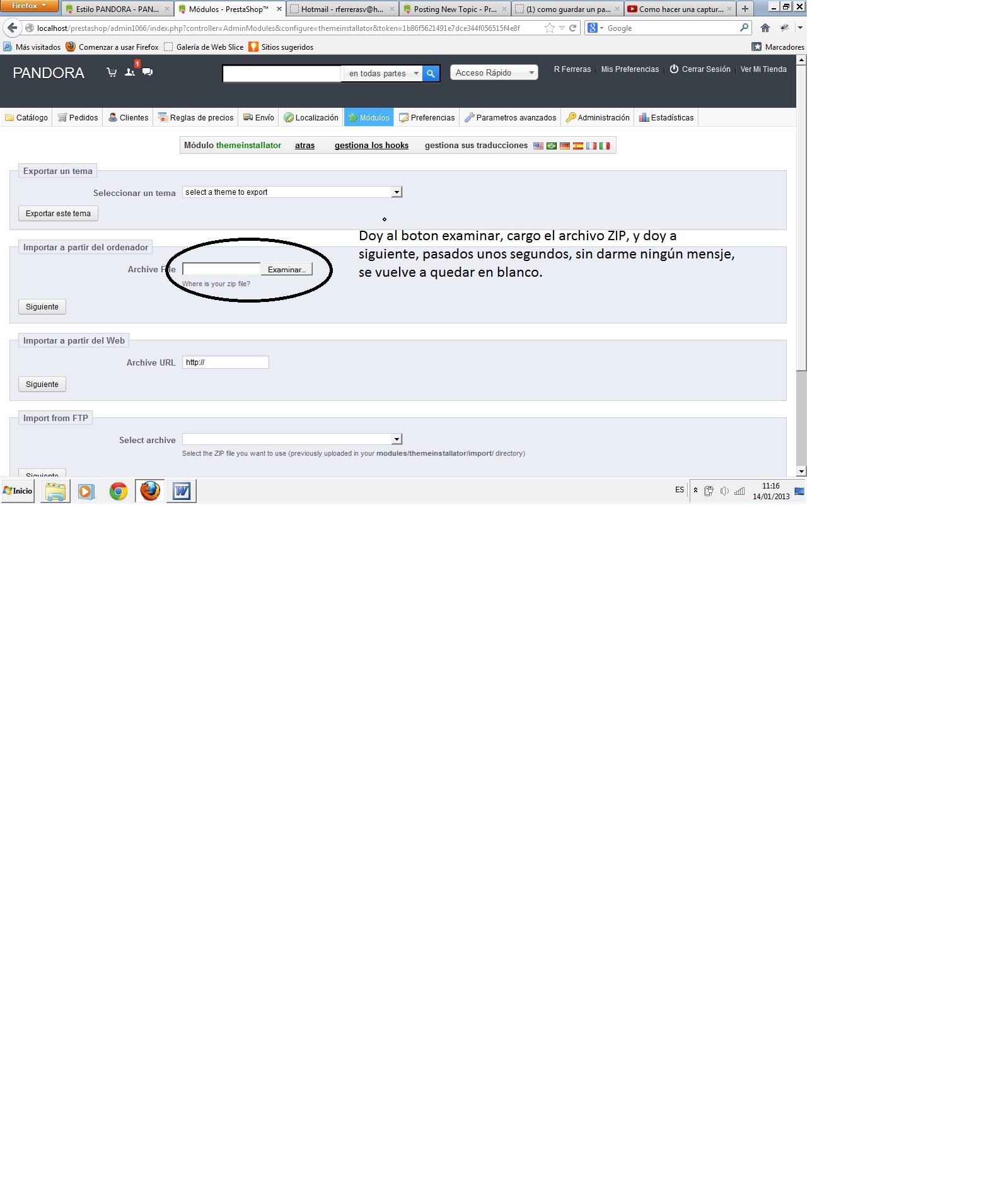 sesese Posted January 14, 2013 Author Share Posted January 14, 2013 (edited) Hola , gracias por responder. Como decía en mi primer post, soy muy novato. He ido a permisos, admimistrador y los he activado todos. He intentado volver a cargar y nada. He vuelto a la página donde descargué la plantilla y he descargado otra versión: http://www.leotheme....shoes-v15x.html Lo curioso es que ahora, cuando cargo esta nueva versión me dice que se ha producido un error durante el envío del archivo. ¿Alguna idea? Es posible que no sea compatible con mi versión? Me podeis dar algún link de alguna plantilla gratis que sea compatible con la versión 1.5.3.1 para probar. Gracias Edited January 14, 2013 by sesese (see edit history) Link to comment Share on other sites More sharing options...
