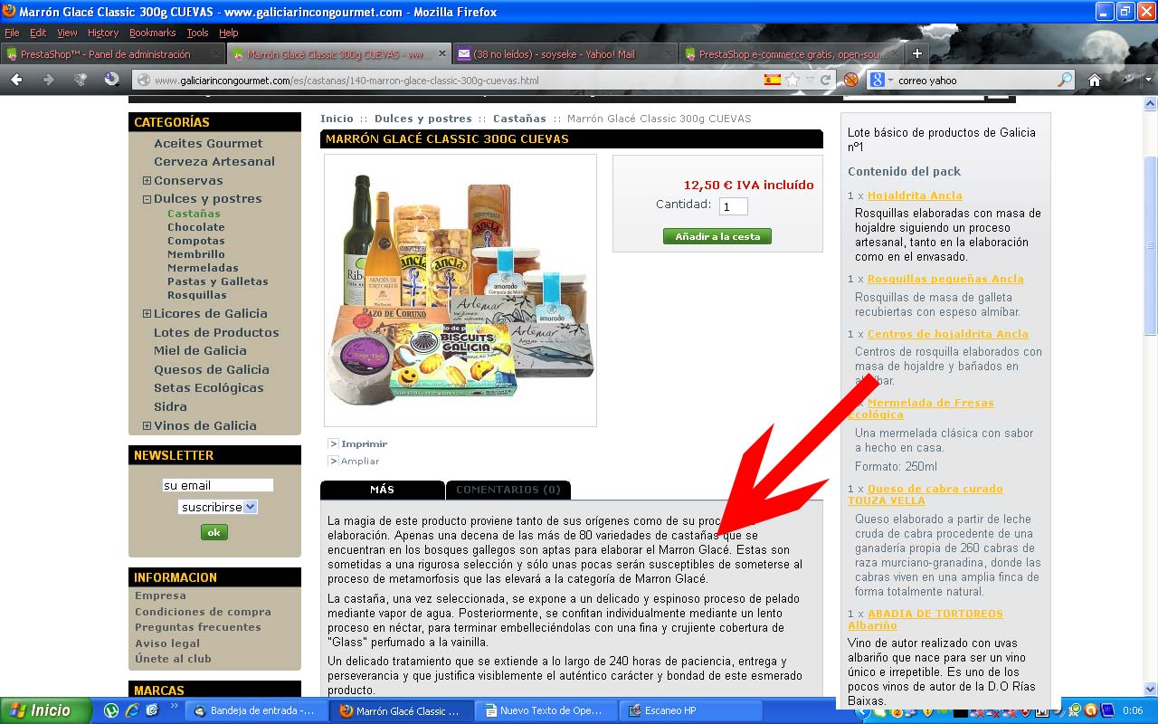 soyseke Posted January 15, 2013 Author Share Posted January 15, 2013 Hola nadie, me gustaría seguir el diseño de la tienda, sería algo como lo que aparece en la imagen 1, es decir, al lado de la foto la ventanita de añadir al carrito con el precio y en la pestaña masa que apareciera la lista de productos del pack, que actualmenta aparece a la derecha de la foto, y eliminar lo de la imagen 2, que hace que la pagina se haga interminable en vertical. Espero que me explicara bien. Gracias Link to comment Share on other sites More sharing options...