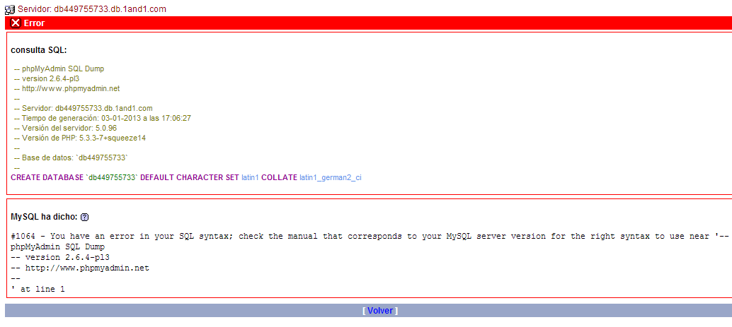 artesanies.es Posted January 16, 2013 Share Posted January 16, 2013 Ten en cuenta que si desde phpMyAdmin ya tienes la base de datos creada y estás importando desde dentro, tendrás que quitar también la parte de CREATE DATABASE... Buenos dias a todos, hace unos dias realice una copia de la BD ya que estaba migrando mi dominio a uno nuevo, cuando intento restaurar la copia de la BD e importar los ficheros me da el error que adjunto en la imagen. ¿¿alguien puede ayudarme?? Muchas gracias a todos Link to comment Share on other sites More sharing options...