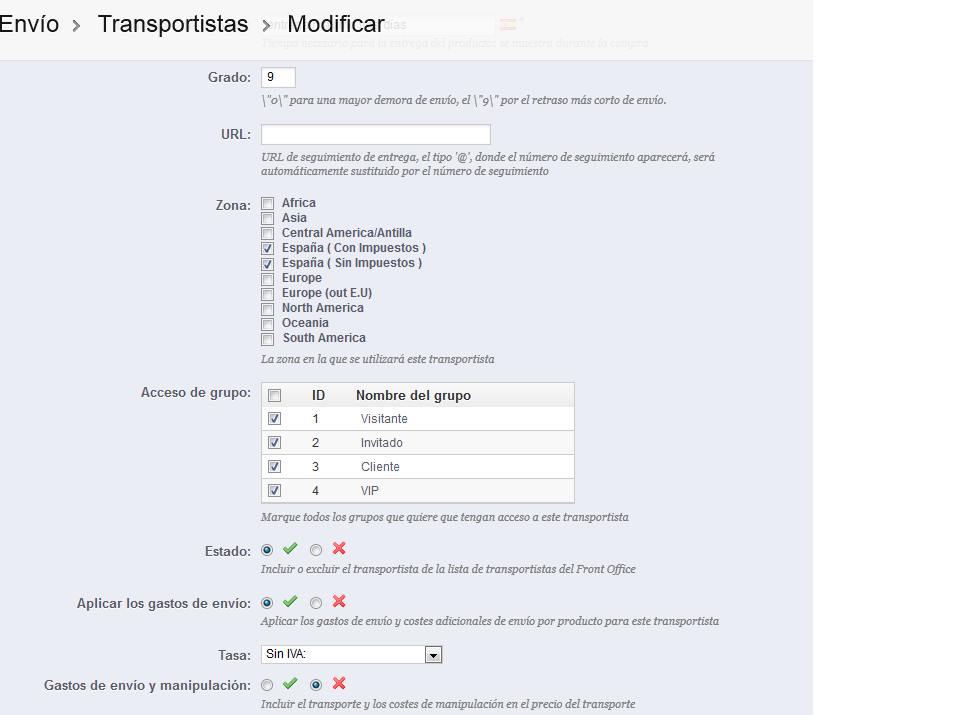 Sergio Ruiz Posted January 19, 2013 Share Posted January 19, 2013 El problema de eso es que cuanto si el cliente se loguea ( y si funciona lo del precio) y supera una cantidad de pedido, si le debe de salir lo de envio gratuito. Si hago lo que me dices siempre saldra lo de "segun destino" , verdad ??? Creo que el problema puede estar en algo que tengo mal en la configuracion de las zonas, pero llevo horas probando y nada. Gracias ! Pega imagen de configuracion del transportista. Link to comment Share on other sites More sharing options...