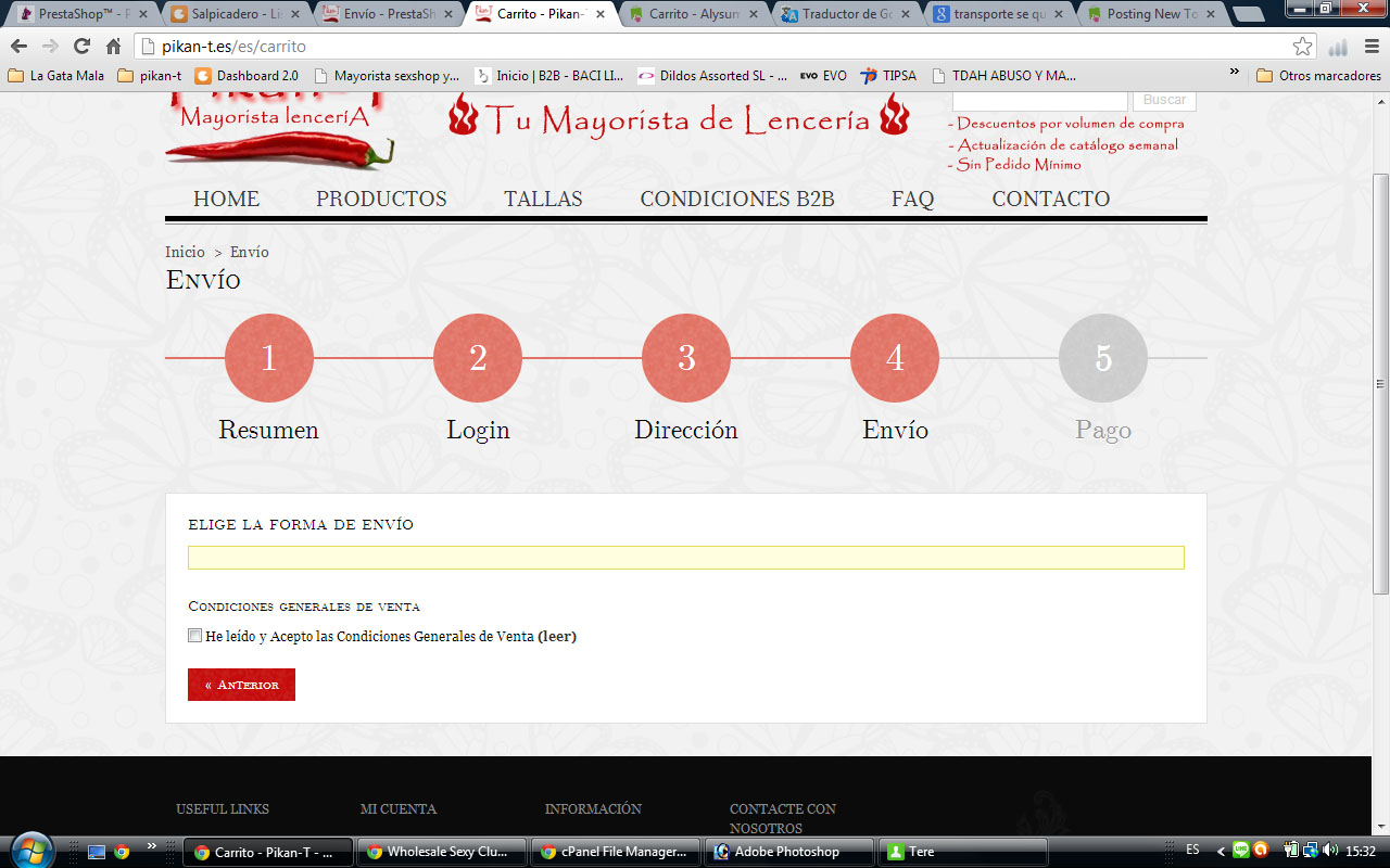 wolfita Posted January 19, 2013 Share Posted January 19, 2013 (edited) Buenas tardes!! En primer lugar comentaros que es la primera vez que necesito crear un hilo pidiendo ayuda urgente!!! ya que en otras ocasiones que la he necesitado siempre he encontrado la solución a mi problema gracias a muchos miembros de este foro que se dedican a prestar ayuda a personas que como yo no somos expertas en la materia. Gracias! Os paso mi problema a ver si algún alma caritativa me pudiera echar un cable!! jijij Acabo de actualizar mi tienda de la versión 1.5.2 a la 1.5.3 y todo ha ido correcto menos en principio el tema de los transportistas. Los tengo agregados, sin embargo cuando hago un pedido de prueba, me sale en el carrito envío gratis (tengo asignados unos gastos de envío de 4,95€ para pedidos inferiores a 150€) y cuando confirmo para iniciar el proceso de pedido, cual es mi sorpresa que el campo de envío está vacío, como si no existiera ningún transportista. Ya no sé qué hacer, he eliminado los transportistas, los he vuelto a crear, he creado reglas de precios para ellos, los he configurado, y nada..... os paso un pantallazo de cómo se ve en la tienda. Por favor, necesito una solución mi tienda es: www.pikan-t.com Gracias de antemano! Edited January 21, 2013 by wolfita (see edit history) Link to comment Share on other sites More sharing options...