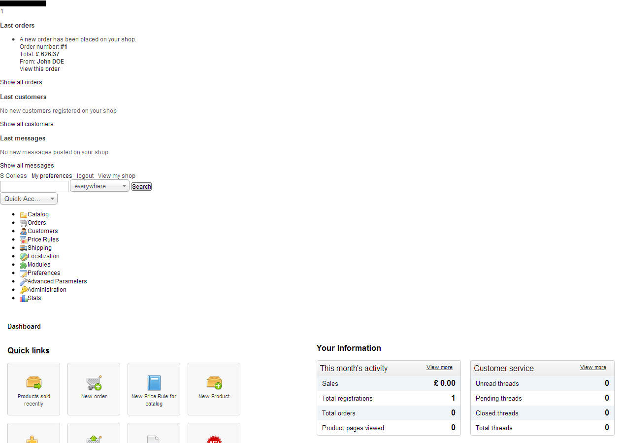 SiCo Posted January 21, 2013 Share Posted January 21, 2013 I have just installed Prestashop 1.5.3.1 from scratch on my test environment (Windows 7) and it all works fine except the admin backend layout won't load properly. Specifically the header/navigation doesn't load correctly (see attached screenshot). I thought it was a missing CSS file but going through the header links to said files they all load fine. I've done a search and can find posts about not being bale to access the backend but I have no problem with that. A screenshot is attached. I have turned off caching (as recommended somehwere here), I have cleared my browser cache (it's happening in IE, Chrome and Firefox), I have replaced the admin theme and it still doesn't work. Any ideas? Link to comment Share on other sites More sharing options...