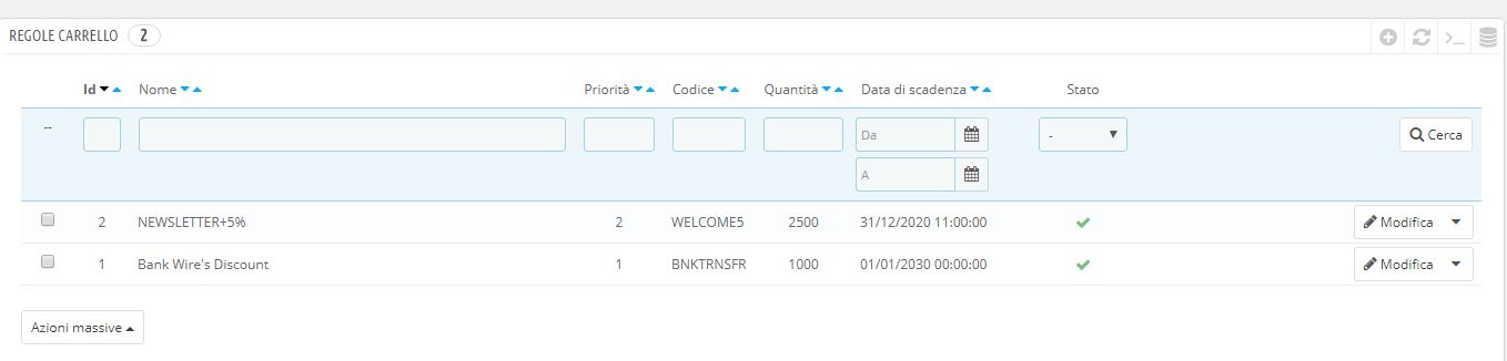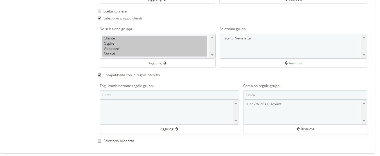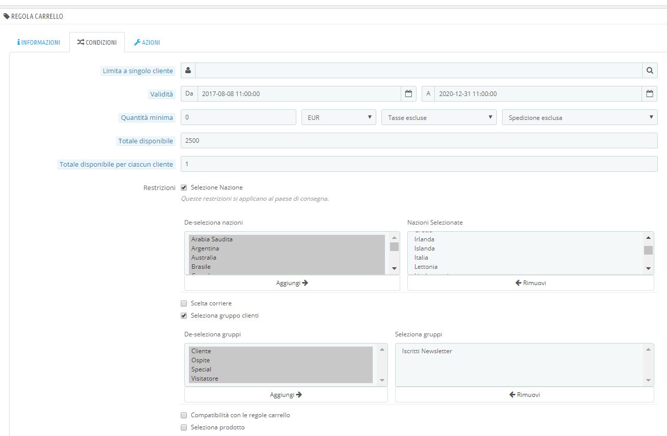 fonderiapassarelli Posted August 8, 2017 Share Posted August 8, 2017 (edited) Salve a tutti, avevo necessità di approfondire anche io il collegamento tra buoni sconto e newsletter. Viene spontaneo scandagliare il forum per vedere se altri utenti hanno lo stesso problema. Spesso però rimangono non risolti. Entrando in Moduli / Regole carrello e cliccando sul punto esclamativo si apre la guida che (seppure in inglese) spiega come creare le regole per svariati tipi di eventi. Per esempio possiamo creare un Gruppo di Clienti particolare da associare alla funzione delle newsletter. In Clienti / Gruppi, la guida spiega che possiamo creare svariati gruppi di clienti, per applicare le regole che vogliamo. Io ho creato un gruppo chiamato "Iscritti newsletter", e ho definito da qui alcune regole; poi dalla sezione Regole carrello l'ho associato ad un Buono sconto ben preciso. Il gruppo appena creato non contiene nessun cliente all'inizio, il problema è anche che in questa lista i clienti non finiscono in automatico, come avviene per il gruppo predefinito Clienti. Sto facendo delle prove, ma mi restano dei dubbi. Ho creato la mia regola carrello per gli iscritti alla Newsletter con codice WELCOME5. Poi, in Moduli / Newsletter / configura, ho collegato il codice. Ora se qualcuno mi sa spiegare se il tutto è giusto o se mi sfugge qualcosa, accetto interventi. Barbara Edited September 8, 2017 by fonderiapassarelli (see edit history) Link to comment Share on other sites More sharing options...