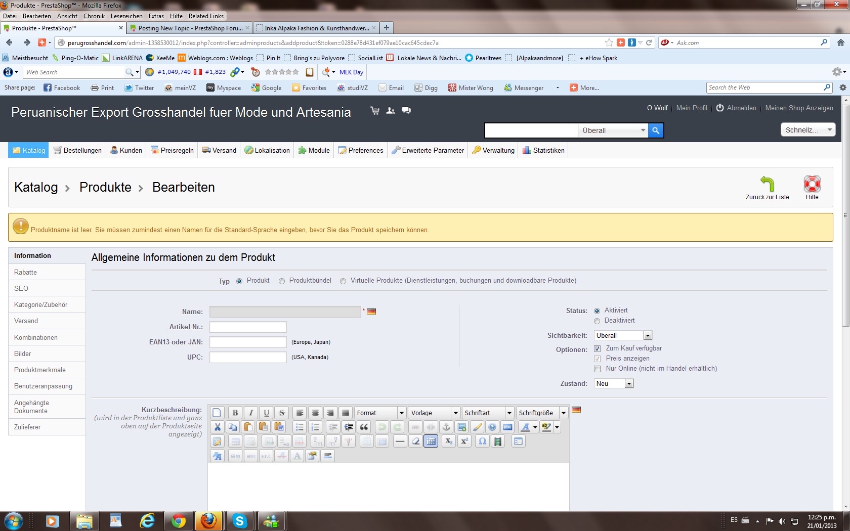 alpakaandmore Posted January 21, 2013 Share Posted January 21, 2013 Erst einmal ein Hallo und bitte falls das ganze ein User error ist, seit gnaedig mit mir :-). Ich bin von Cubecart zu PrestaShop gewechselt und nun nachdem ich Presta das 2.mal installiert habe etwas ratlos. Alles laueft bis zu diesem Punkt fein. Nun wollte ich anfangen produkte einzustellen. In dem Reiter Katalog > Produkte > Bearbeiten bekomme ich immer folgende Meldung: Produktname ist leer. Sie müssen zumindest einen Namen für die Standard-Sprache eingeben, bevor Sie das Produkt speichern können. Das Eingabefeld fuer den Produktnamen ist aber geblocked und ich kann den Produktnamen nicht eingeben. Alle anderen Felder funktionieren einwandfrei soweit ich sehe. Informationen über den Shop http://www.perugrosshandel.com PrestaShop-Version: 1.5.2.0 URL Ihres Shops: http://perugrosshandel.com/ Name des verwendeten Themas: default Informationen: Informationen zu Ihrer Konfiguration Informationen auf Ihrem Server Informationen auf Ihrem Server: Linux #1 SMP Wed Oct 10 19:15:25 EDT 2012 x86_64 Version der Server-Software: Apache PHP-Version: 5.2.17 Speichergrenze: 64M max_execution_time: 30 Datenbank-Informationen MySQL-Version: 5.5.23-55 MySQL-Engine: InnoDB Tabellen-Präfix: ps_ Informationen über Ihren Shop Ich habe einen Screenshot mit angehaengt . Ich will mich schon einmal fuer die Antworten/Hilfe bedanken, da ich wirklich ratlos bin und auch in den Beitraegen nichts gefunden habe, was mir wirklich weiter hilft. Link to comment Share on other sites More sharing options...