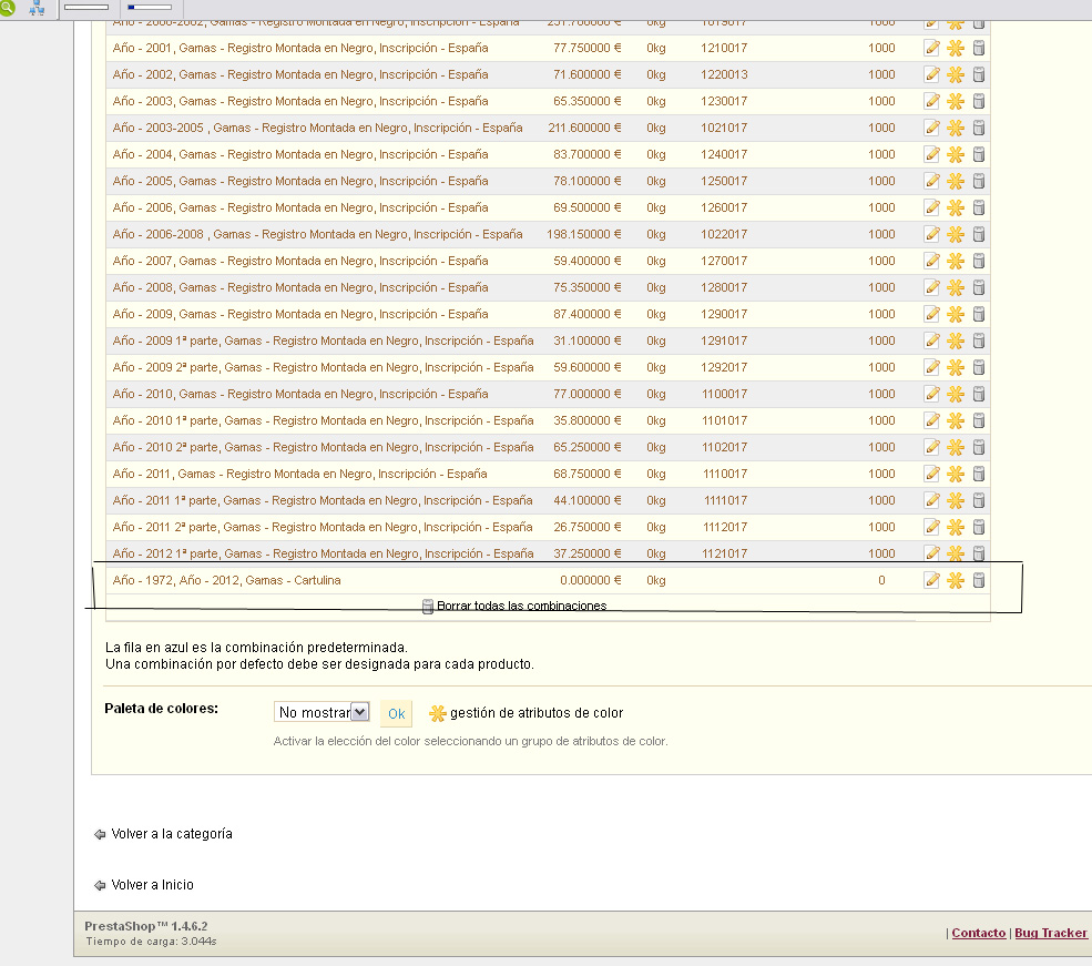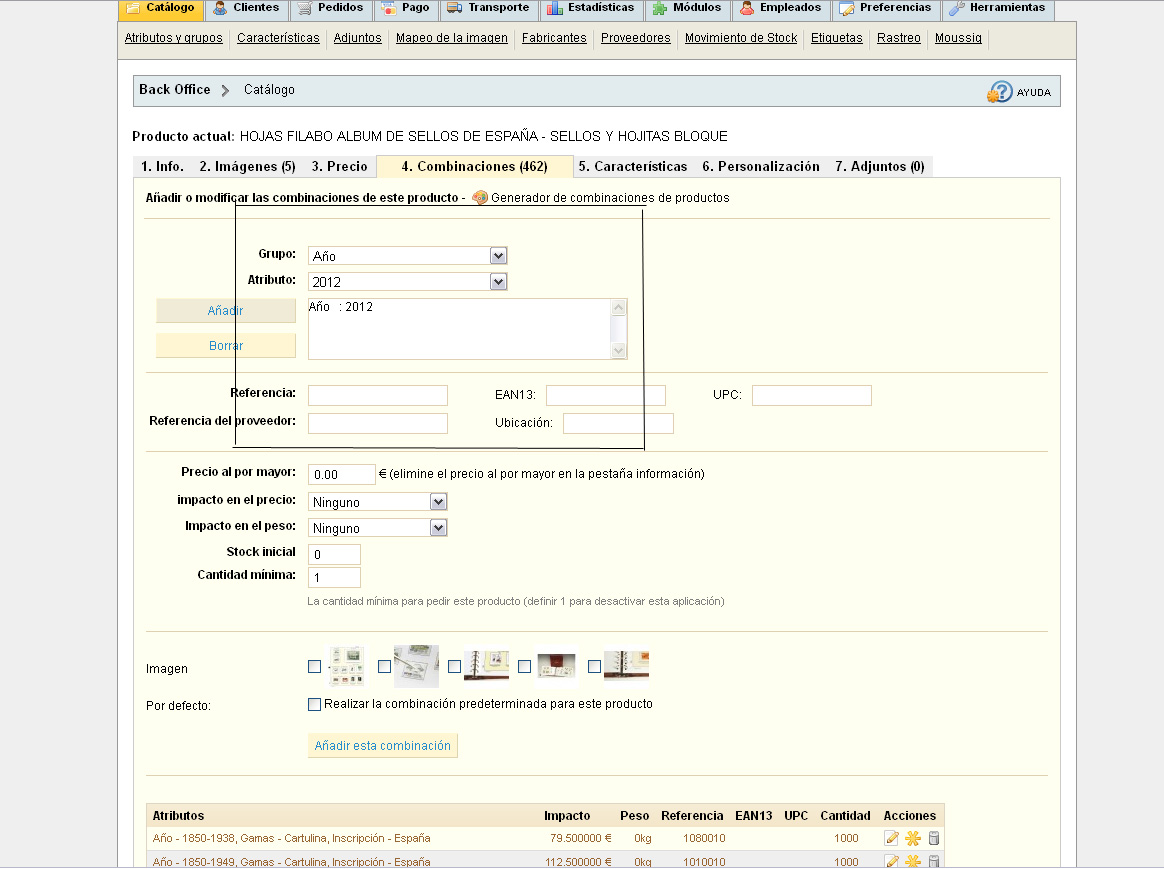 monxu Posted January 22, 2013 Author Share Posted January 22, 2013 Gracias por contestar. He creado ya muchas combinaciones, el problema ha empezado desde que cambié de alojamiento. Te adjunto capturas, verás que hago una combinación sencilla, atributo "año" 2012. Me crea otros atributos que no he puesto. Link to comment Share on other sites More sharing options...
