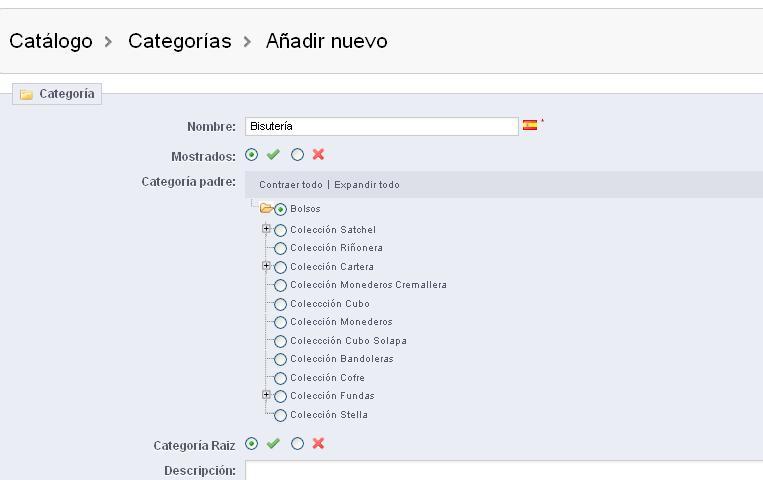 dagodeca Posted January 23, 2013 Share Posted January 23, 2013 Debes indicar la categoria padre. Seguramente la categoria bisuteria tenga como categoria padre bolsos. Indicale Inicio si quieres tenerla fuera en la parte principal o dentro de otra categoria. Link to comment Share on other sites More sharing options...