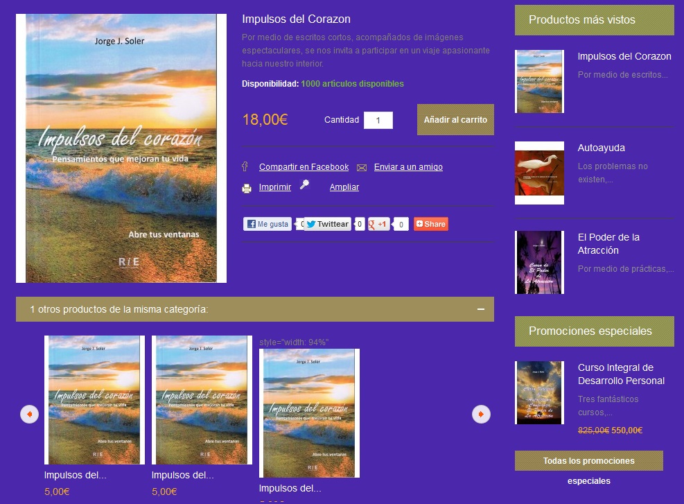 dunkeld Posted January 28, 2013 Share Posted January 28, 2013 (edited) Hola Tengo unos problemas en mi página que no logro solucionar. Cuando visualizo el detalle de un producto; como el siguiente http://www.creercrea...el-corazon.html Me encuentro que los botones de facebook, google y demás no se encuentran bien alineados; y además mas abajo donde me muestra otros productos de la misma categoria, me aparecen más productos de los que realmente hay dados de alta. En este caso concreto, son libros,ambos se llaman igual, uno es formato impreso y otro electrónico. Pues en vez de aparecer uno tan solo, aparecen tres y encima el último lo muestra desplazado hacia abajo en el slider y con un codigo de html encima del mismo. Esto me ocurre en productos de otras categorias y lo achaco a que éstos tienen varias combianaciones, pero no logro solucionar estos pequeños defectos. Además me cambia el color de fondo de la página justo antes del footer, esto se puede apreciar mejor si vemos en el apartado de avisos el aviso legal. Gracias de antemano. Gracias Edited February 3, 2013 by dunkeld (see edit history) Link to comment Share on other sites More sharing options...
