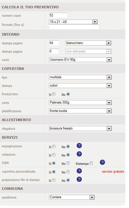 davidde Posted February 2, 2013 Author Share Posted February 2, 2013 Buongiono, avrei la necessità di creare all'interno del mio sito una pagina che elabori preventivi istantanei a chi ne faccia richiesta. Si tratta di preventivi per la pubblicazione di libri. L'Esempio che allego di seguito l'ho preso da un altro sito, ed è quello che a me servirebbe, Esiste un modulo per far questo? C'è qualcuno in grado di farmelo? Quanto può costare? Grazie. P.s.Ho già posto questa domanda una settima fa circa, come mai non mi risponde nessuno? Link to comment Share on other sites More sharing options...