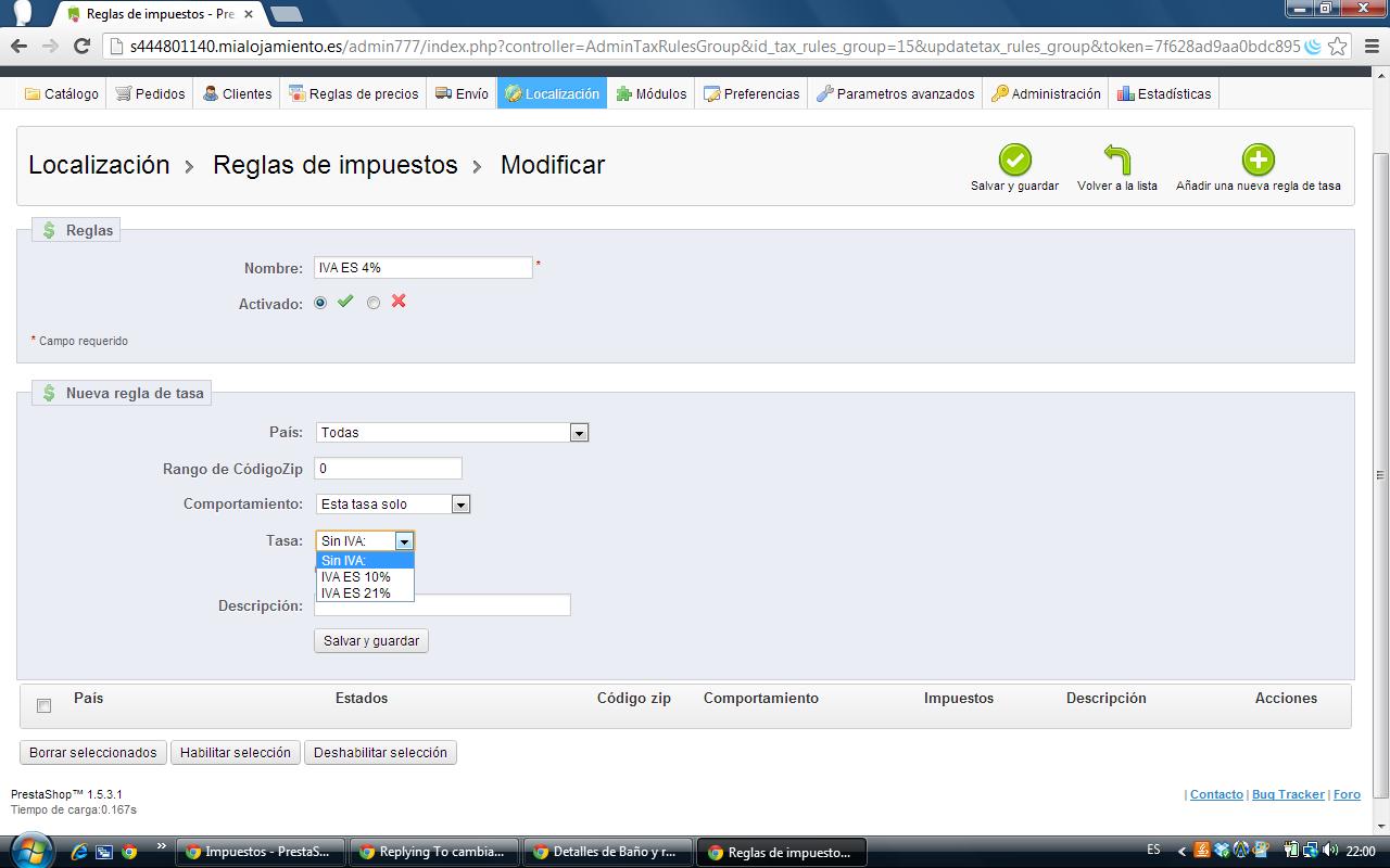 nadie Posted January 30, 2013 Share Posted January 30, 2013 gracias pero eso es lo que he hecho pero no me calcula el 21% me deja el mismo valor que precio minorista Has señalado, ¿que la regla se aplique a las correspondientes paises y estados, al pulsar sobre la regla en cuestión? ----- Otro tema, en la pestaña Localización -> Localización ¿Que país tienes por defecto? 1 Link to comment Share on other sites More sharing options...