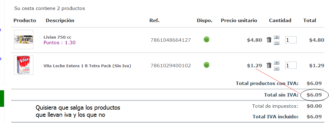 Ricardo Kiimak Posted January 30, 2013 Share Posted January 30, 2013 (edited) Hola amigos estoy revizando mi tienda y no me sale los productos que tienen iva y los que no tiene iva me suma todo en uno solo como que llevan iva queria saber si hay manera de que se vayan sumando los que tienen iva y los que no llevan iva . Les dejo una imagen Hola amigos estoy revizando mi tienda y no me sale los productos que tienen iva y los que no tiene iva me suma todo en uno solo como que llevan iva queria saber si hay manera de que se vayan sumando los que tienen iva y los que no llevan iva . Les dejo una imagen Edited January 30, 2013 by Ricardo Kiimak (see edit history) Link to comment Share on other sites More sharing options...
