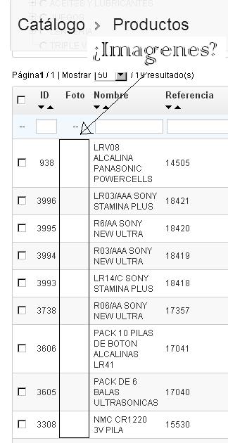 entendiendonos Posted January 31, 2013 Share Posted January 31, 2013 (edited) En la pestaña de productos, no consigo ver las imágenes de dichos productos a no ser que entre y cada uno de ellos y los busque, por lo que no me puedo orientar viendo imágenes, sino sabiendo que articulo es cada uno en base a su nombre o referencia. Adjunto captura para verlo mas claro. ¿Como puedo volver a verlas? Un saludo y gracias por vuestro interés. Edited February 5, 2013 by entendiendonos (see edit history) Link to comment Share on other sites More sharing options...