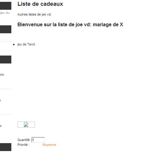 promantis Posted February 1, 2013 Share Posted February 1, 2013 Bonjour, Petit problème d'affichage des images avec le bloc liste de cadeaux (wishlist) Version PrestaShop 1.5.3 version bloc liste cadeaux : 0.2 Le client fait sa liste, la liste est envoyée à ses invités, le lien dans le mail invité donne accès à la liste créée par le client. l'invité arrivant dans la liste n'a que les titres, les photos ne s'affichent pas !! Voir capture. Quelqu'un a une idée du problème et la solution à apporter ? Merci Link to comment Share on other sites More sharing options...