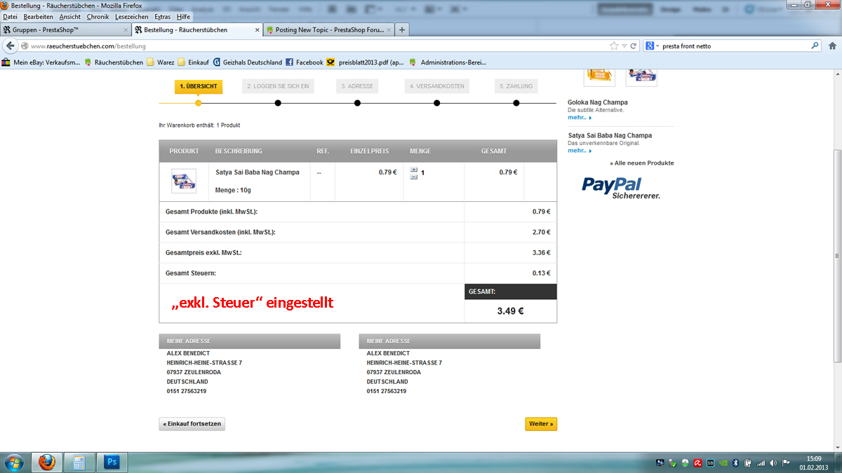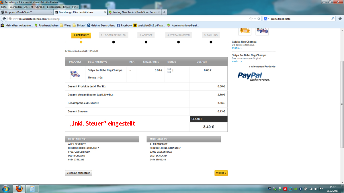 Raeucherstuebchen Posted February 1, 2013 Share Posted February 1, 2013 Hallo liebes Prestashop-Forum! Ich habe ein ungewöhnliches Steuerproblem: Wenn ich in den Kundengruppen bei Preisanzeige "Inkl. Steuer" auswähle, dann steht im Warenkorb hinter Gesamtprodukte, Gesamtversandkosten immer "exkl. Steuer" Wenn ich aber "inkl. Steuer" einstelle, dann erscheinen im Warenkorb die Preise "exkl. Steuer", die Steuer wird aber trotzdem im Endpreis mit eingerechnet. Das ist wie vertauscht. Außerdem erscheinen die Preise bei "inkl. Steuer" im gesamten Frontend als Nettopreise. Anbei 2 Screenshots: Link to comment Share on other sites More sharing options...