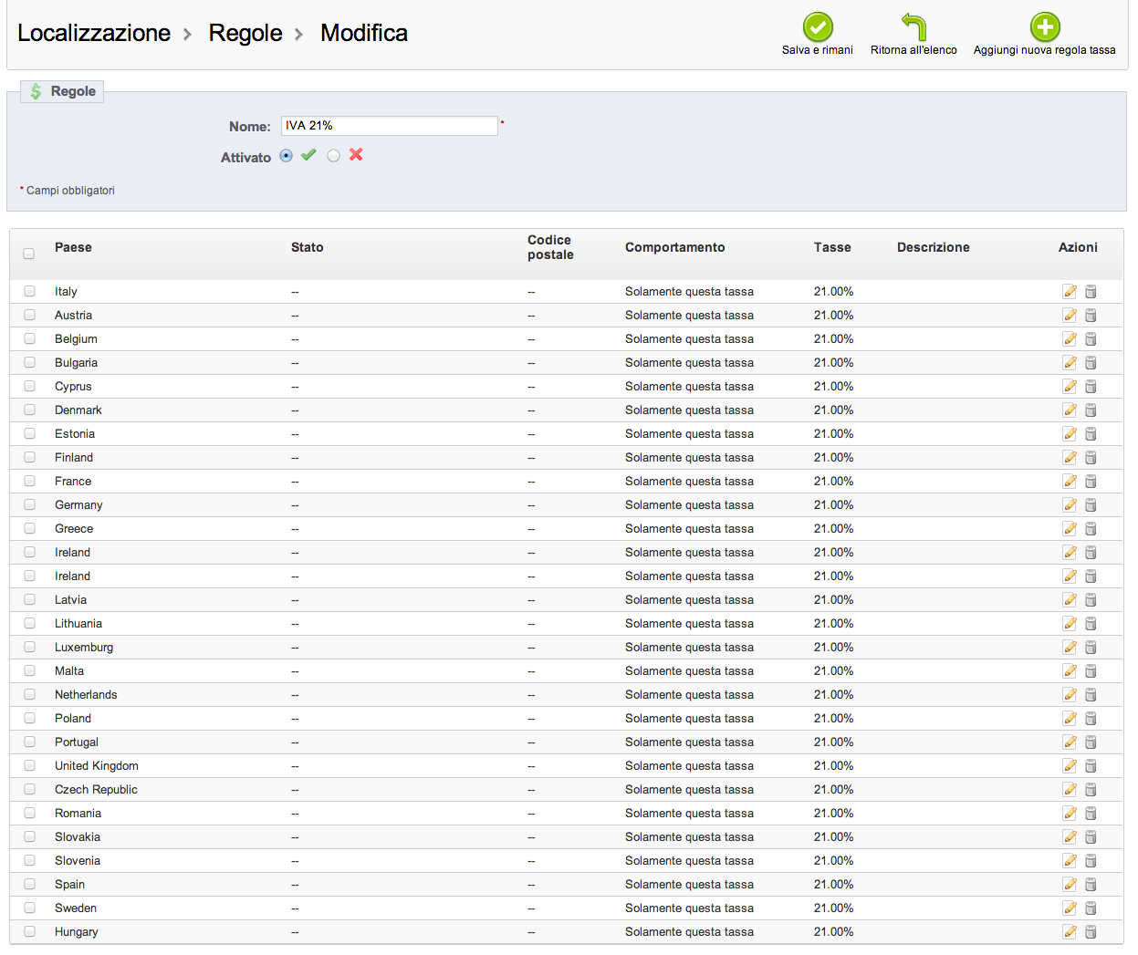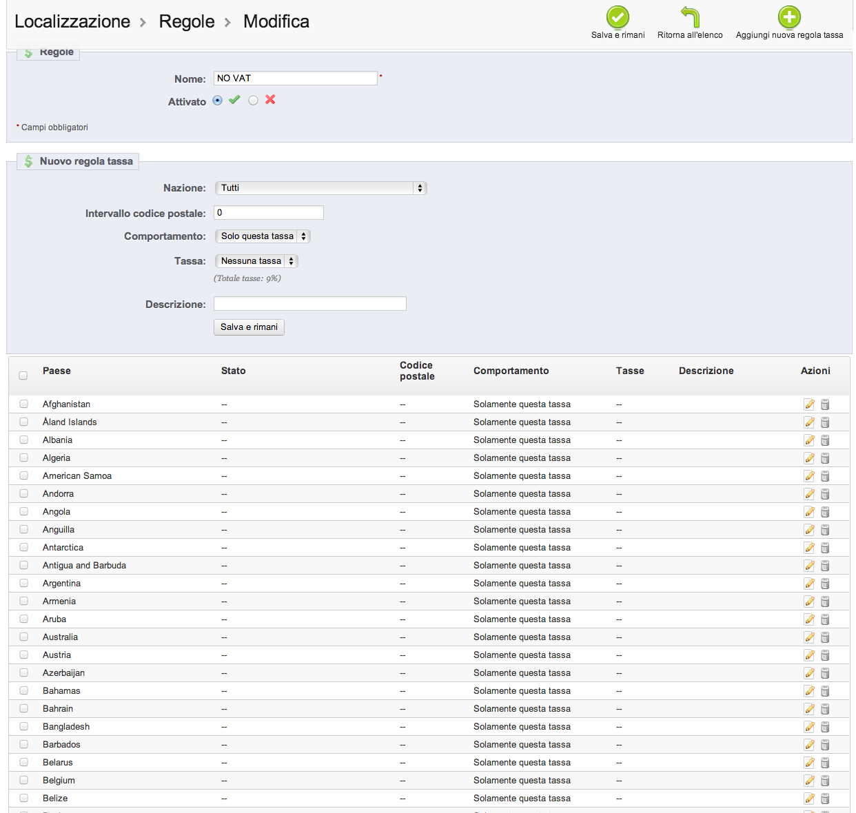 mdsoft Posted February 1, 2013 Share Posted February 1, 2013 Ciao ragazzi, in base alle mie prime esperienze con Prestashop 1.5, posso scrivere una piccola guida soluzione riguardo il regime iva in ambito Business to Consumer. In base alla normativa vigente possiamo vendere i prodotti senza iva ai consumatori fuori dall'Unione Europea. E' necessario emettere fattura non imponibile Iva art 8 dpr 633 / 1972 Co questa soluzione : tutti i clienti potenziali della Comunità Europea vedranno i prezzi Inclusi di Iva. tutti i clienti potenziali che non appartengono alla Comunità Europea (Extra UE) ,solo se registrati sul nostro sito, vedranno il prezzo del prodotto esposto senza iva. Una volta impostata la TASSA al 21% nel tab Localizzazione, andiamo a creare le nostre Regole: 1) Andare nel tab localizzazione, poi selezioniamo regole. Selezioniamo aggiungi nuovo, poi nello spazio Nome inseriamo per esempio NO IVA , seleziona attivato e poi salva. Ora modifichiamo la regola appena salvata, premendo sull'icona modifica. Ora seleziona '' Aggiungi nuova regola tassa'', si aprirà un nuovo tab ''Nuova regola tassa'', seleziona in Nazione ''TUTTI'' e controllate che il campo ''Comportamento'' sia impostato come: ''solo questa tassa''; ''Tassa'' come Nessuna Tasta''. Ora Premi su Salva e rimani. A questi punto avremo una lista di tutti i paesi in basso. 2) Ritorniamo all'elenco delle regole. Aggiungiamo un altra regola che questa volta possiamo chiamare IVA 21%. A questa regola assegneremo tutti i paesi della comunità europa assegnando però per ognuno dei paesi nel campo Tasse l' Iva 21%. Spero che questa guida faccia risparmiare del tempo in fase di configurazione. Grazie per la lettura Marco Link to comment Share on other sites More sharing options...