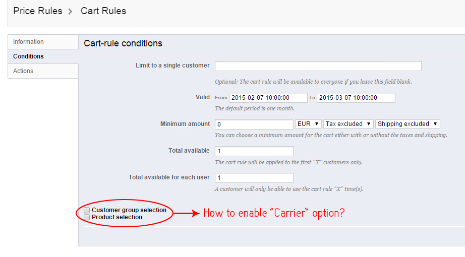 Housy Posted February 7, 2015 Share Posted February 7, 2015 (edited) I read the documentation. This should be set under "Cart rules", where you set conditions but there is a problem. I don't have an option to check the "Carrier" checkbox (see attached photo).How can i add another checkbox for "Carrier"? Thank you and best regards, Housy you can try to create a price rule Edited February 7, 2015 by Housy (see edit history) Link to comment Share on other sites More sharing options...