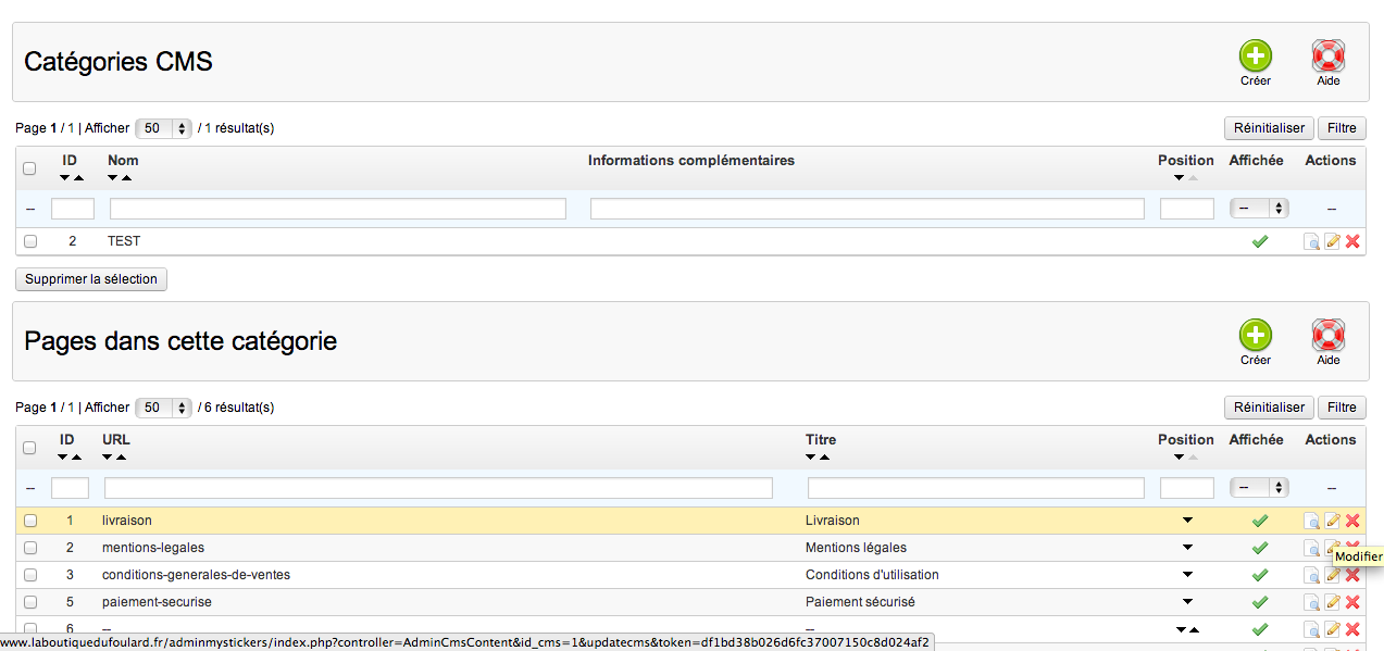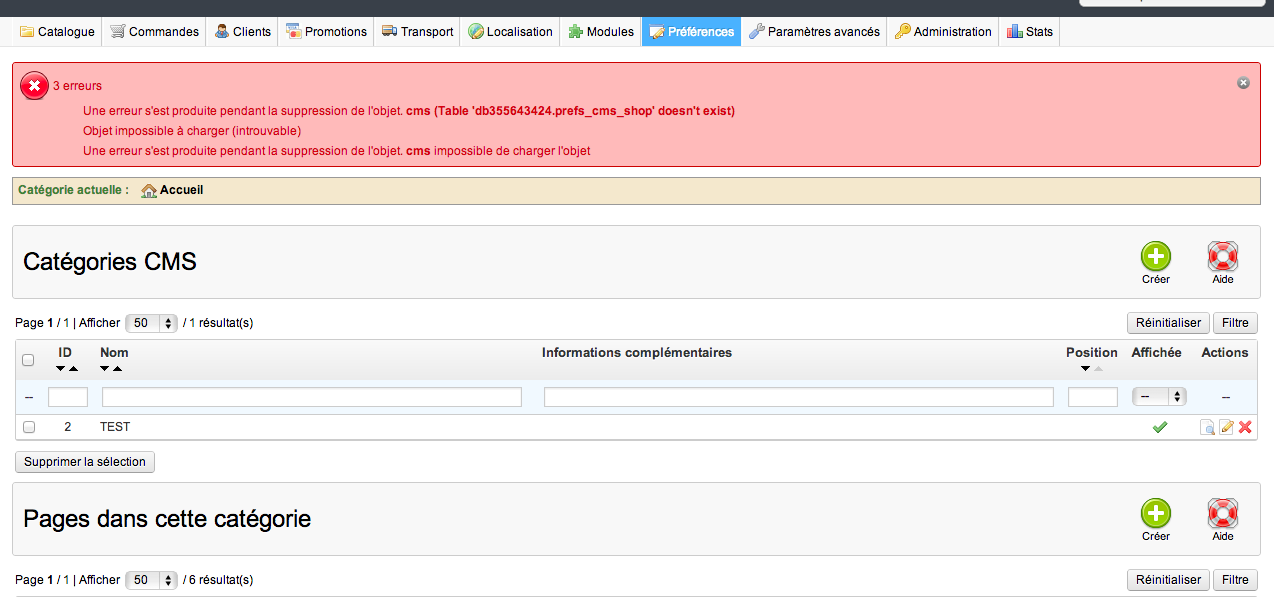 [email protected] Posted February 4, 2013 Share Posted February 4, 2013 Bonjour, Suite à une mise à jour de 1.3.2 vers 1.5.3.1 avec le module automatique MISE A JOUR 1 CLICK. J'ai une page blanche dans le backoffice dans "CMS" quand je clock sur LIVRAISON ou MENTIONS LEGALES et quand j'essaie de les supprimer il m'indique une message d'erreur :-( ci joint les captures d'écran. Franchement merci par avance la je sèche !!!! Link to comment Share on other sites More sharing options...