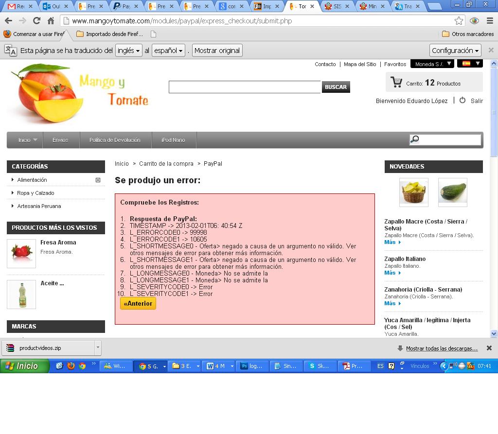 Eduardoshop Posted February 5, 2013 Share Posted February 5, 2013 Good morning, I have to show the error in the attachment (image). In my shop I am working with three currencies: Dollar, Euro, Nuevo Sol (Peru's currency). When I make a purchase with coins Euro or Dollar, can not find any problem, the process is successful, even when client data requests to continue the process and I think until the end of the process there is no problem. The problem is when I use Nuevo Sol currency, at the time when I ask for the option and select Paypal payment when you are connecting with Paypal I get the error of the image. What is happening?, How to solve this problem?. My account is verified and associated with an account in dollars in paypal tell me that does not have to be problem shopping with soles. Thank you. Sorry for the English, but I'm using an online translator. Link to comment Share on other sites More sharing options...