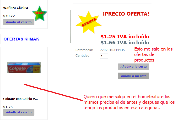Ricardo Kiimak Posted February 5, 2013 Share Posted February 5, 2013 Necesito que me salga el precio que tengo ofertado en los productos que tengo en una categoria en el homefeature, no estan en productos destacados sino que en una categoria del home y me sale en la pantalla principal de la tienda, les dejo una imagen de lo que quiero hacer pero he buscado en el forum y nada.. Link to comment Share on other sites More sharing options...