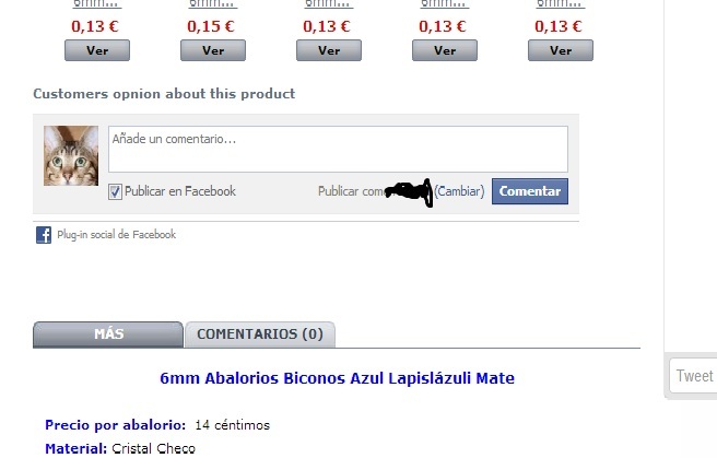 galeriaartesania Posted February 5, 2013 Share Posted February 5, 2013 Hola! Existe algún módulo para poder poner los comentarios del facebook dentro de la descripción del producto? Tengo un módulo pero aparece como se ve en la foto que he adjuntado. Queda como en medio de todo y me gustaría que pudiera aparecer bajo la descripción de producto. Además este módulo tiene publicidad que aparece en el footer y desde que lo he puesto solo aparecen la mitad de los productos destacados que tengo activados en la página principal. Muchas gracias por vuestra ayuda. Saludos! Link to comment Share on other sites More sharing options...