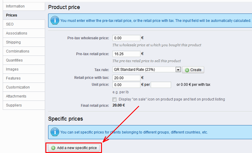 parsifal Posted February 8, 2013 Share Posted February 8, 2013 (edited) Thanks for the link parsifal, I guess everyone is confused about this. So can you point me to a way to use "specific price"? This is exactly what I am trying to do. Sure. For example, in my shop I have a customer group named "Πελάτες Χονδρικής" (Greek for "Wholesale customers") and I set a specific price for them. Have a look: Notice that, in this example, I unticked the "Leave base price" checkbox in order to specify a completely arbitrary price for this customer group. Other users may want to set a new price that is calculated from the base price (either by subtracting a constant value or a percentage of the base price). Edited February 8, 2013 by parsifal (see edit history) 2 Link to comment Share on other sites More sharing options...